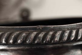 Corpo decorato con motivi di gusto neoclassico e baccellature, coperchio decorato con un motivo a palmette, unito al corpo da tre catenelle