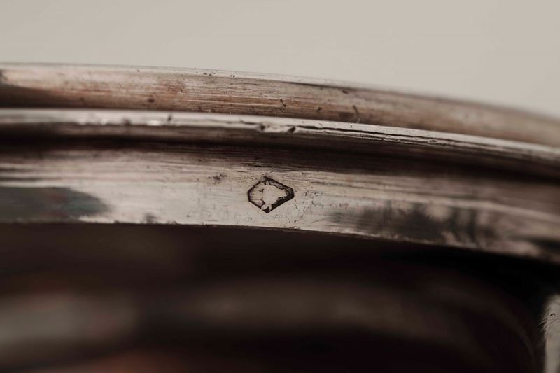 Paiola in argento fuso, sbalzato e cesellato. Torino XIX secolo, marchio di titolo con testa di toro in uso dal 1824 al 1872