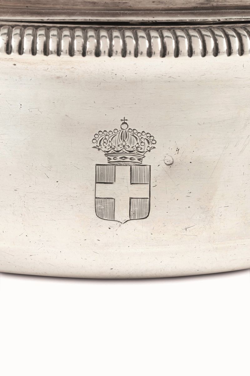 Corpo liscio con decori a baccellatura, anse laterali sagomate con motivi fogliacei e presa a pomo. Sul coperchio e sulla fascia inciso a cesello lo stemma di Casa Savoia.