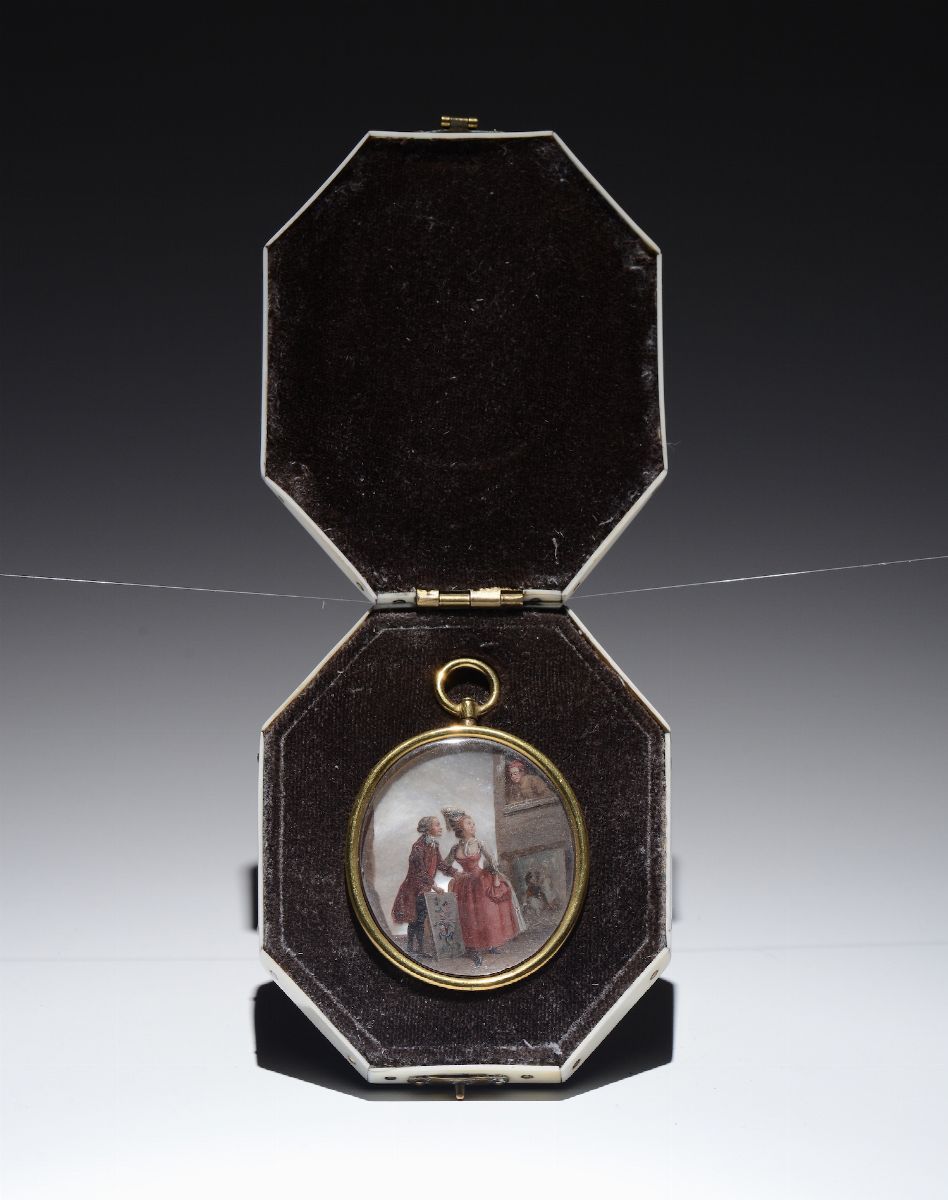 Pendente ovale in argento dorato con al centro miniatura su madreperla con scene di genere. XVIII secolo