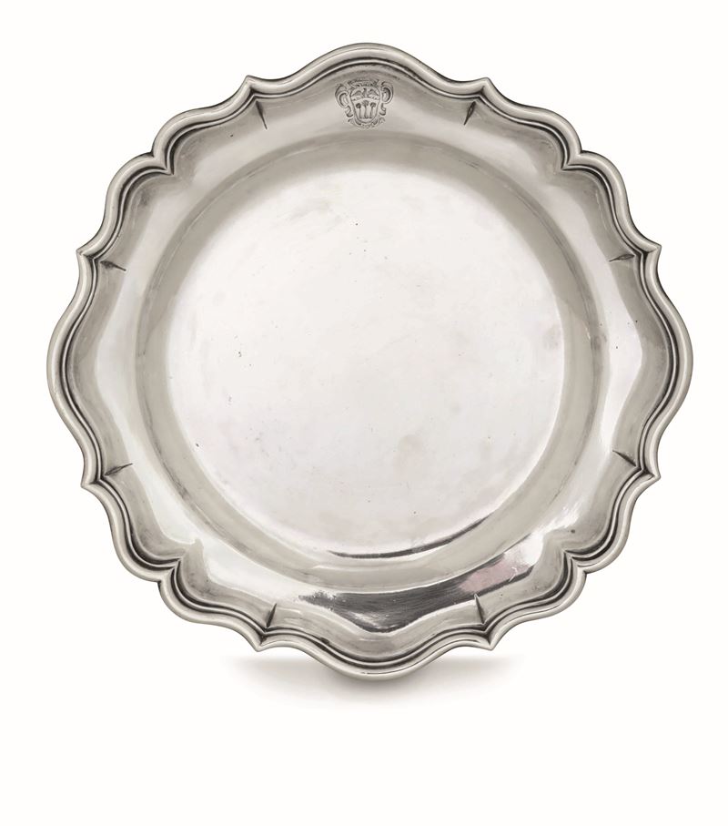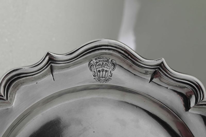 Piatto in argento sbalzato. Manifattura lombarda del XVIII secolo. Bollo dell'argentiere non identificato.