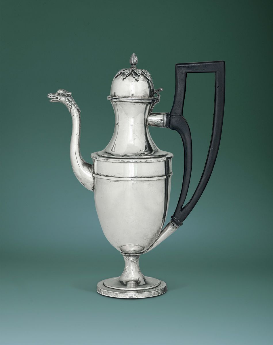Rara caffettiera in argento fuso, sbalzato e cesellato. Regno di Sardegna, Cagliari secondo quarto del XIX secolo, argentiere Luigi Montaldo, assaggiatore Luigi Cirronis