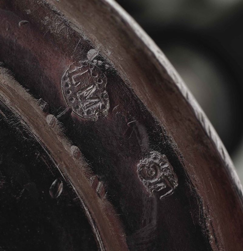 Corpo a vaso poggiante su basso piede circolare, alto versatoio con beccuccio terminante con testa di animale fantastico e coperchio bombato con presa a foggia di bocciolo adagiato su elementi fogliacei. Elegante e insolito manico in legno ebanizzato con doppie volute a virgola soprastanti.