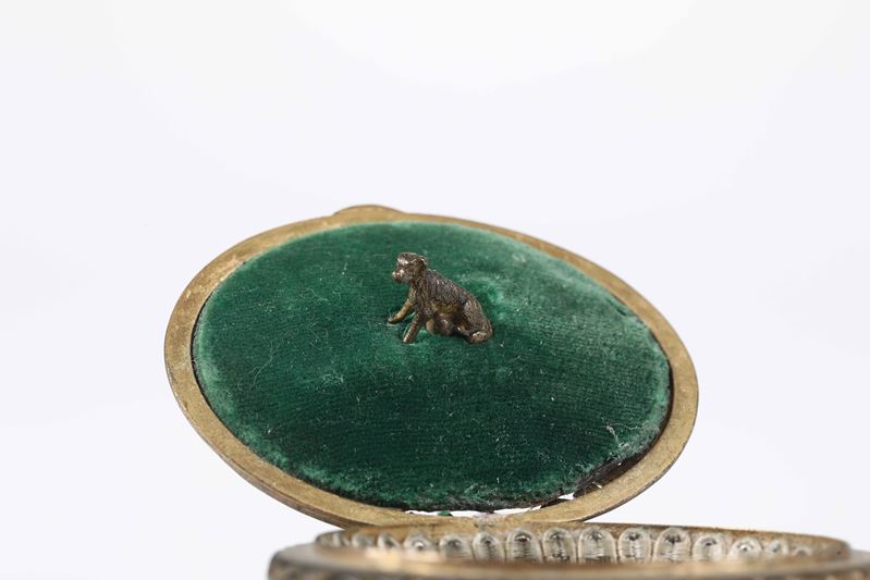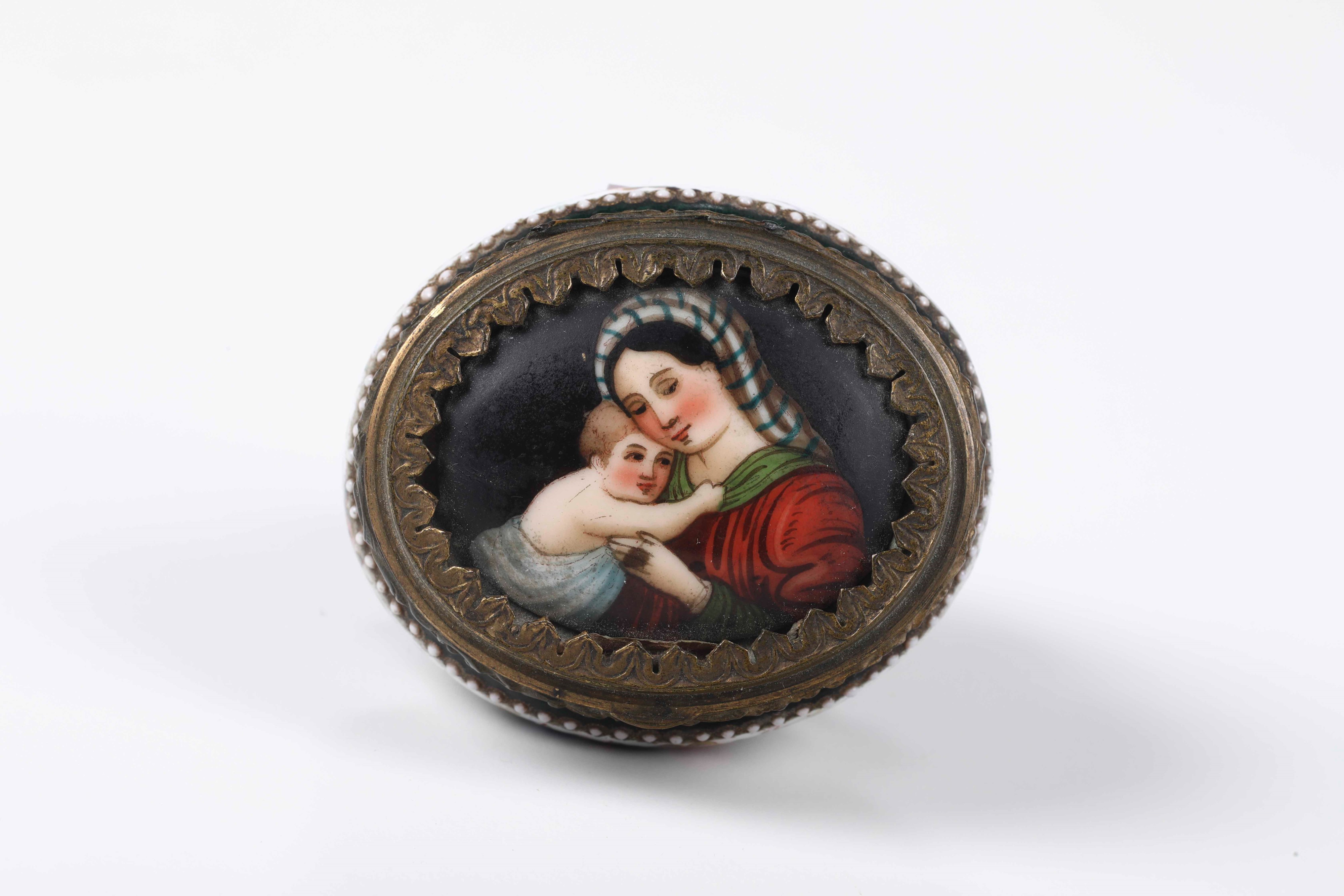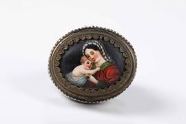 Forma ovale con cornice del coperchio decorata a palmette contenente raffigurazione di Madonna con Bambino in smalto policromo