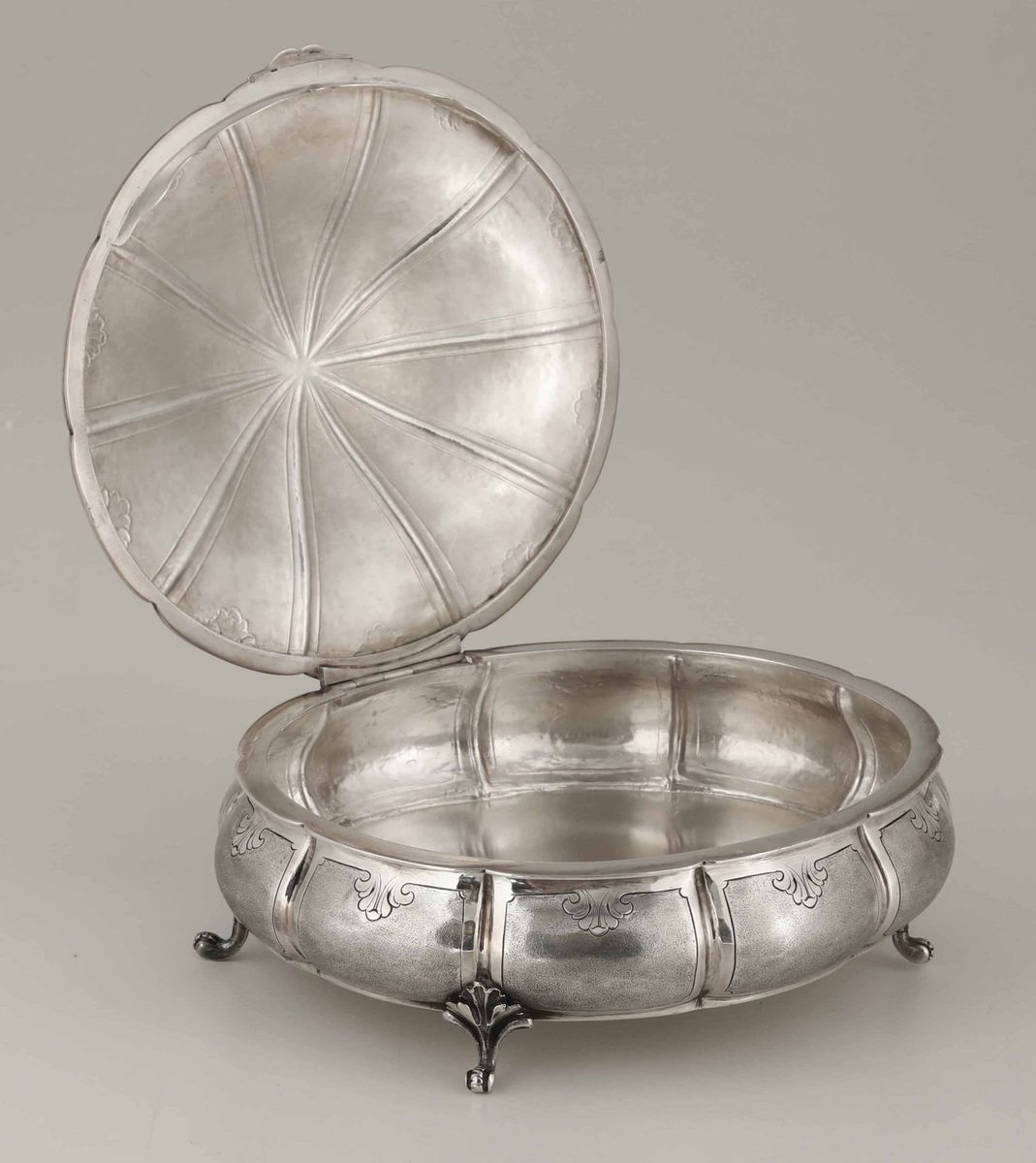 Scrigno porta gioie in argento fuso e cesellato, argenteria artistica Italiana. Marchio con fascio littorio in uso dal 1935 [..]