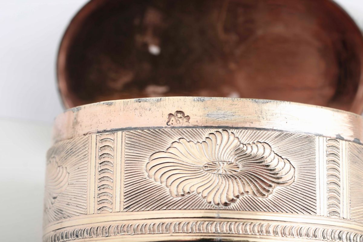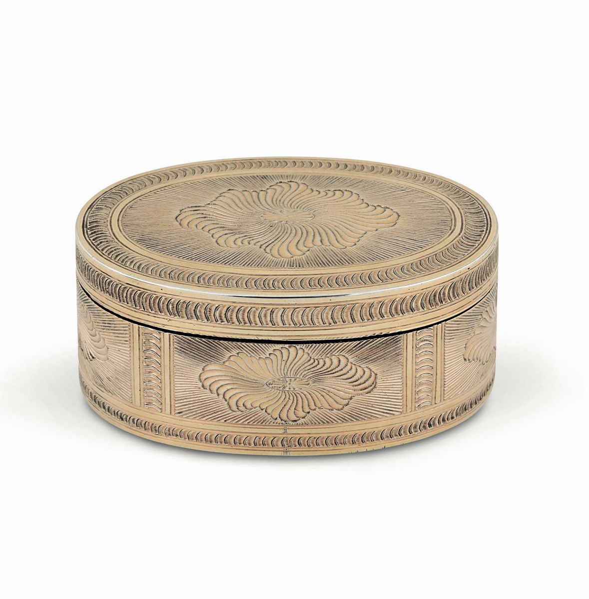 Tabacchiera ovale in argento fuso, sbalzato, cesellato e dorato entro custodia in pelle Maison Bulgari. Manifattura italiana della seconda metà del XVIII secolo (Venezia?)