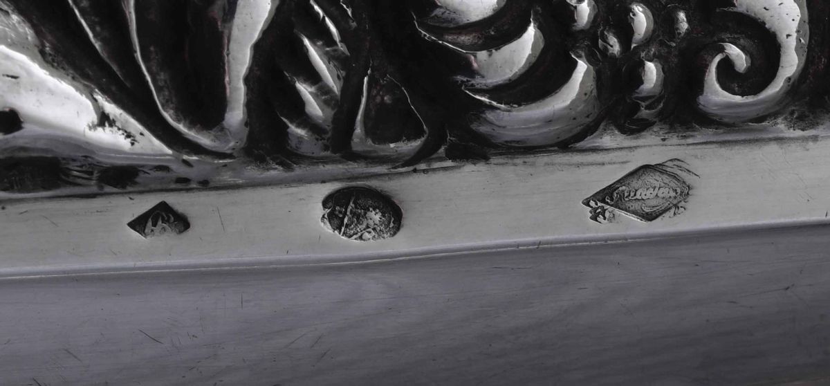 Vassoio in argento fuso, sbalzato e cesellato. Manifattura italiana del XIX secolo. Marchio della città e dell’argentiere Guadagni