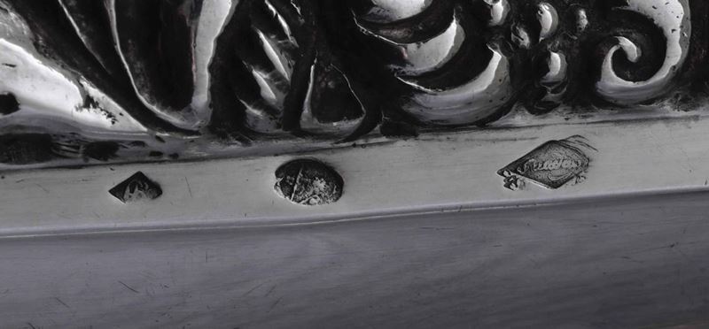 Vassoio in argento fuso, sbalzato e cesellato. Manifattura italiana del XIX secolo. Marchio della città e dell’argentiere [..]
