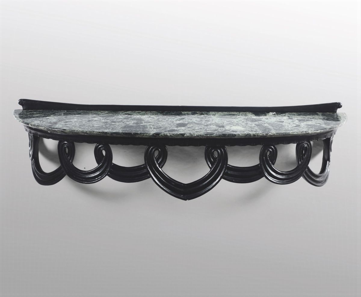 Consolle a parete con struttura in legno laccato scolpito e piano in marmo verde Alpi.