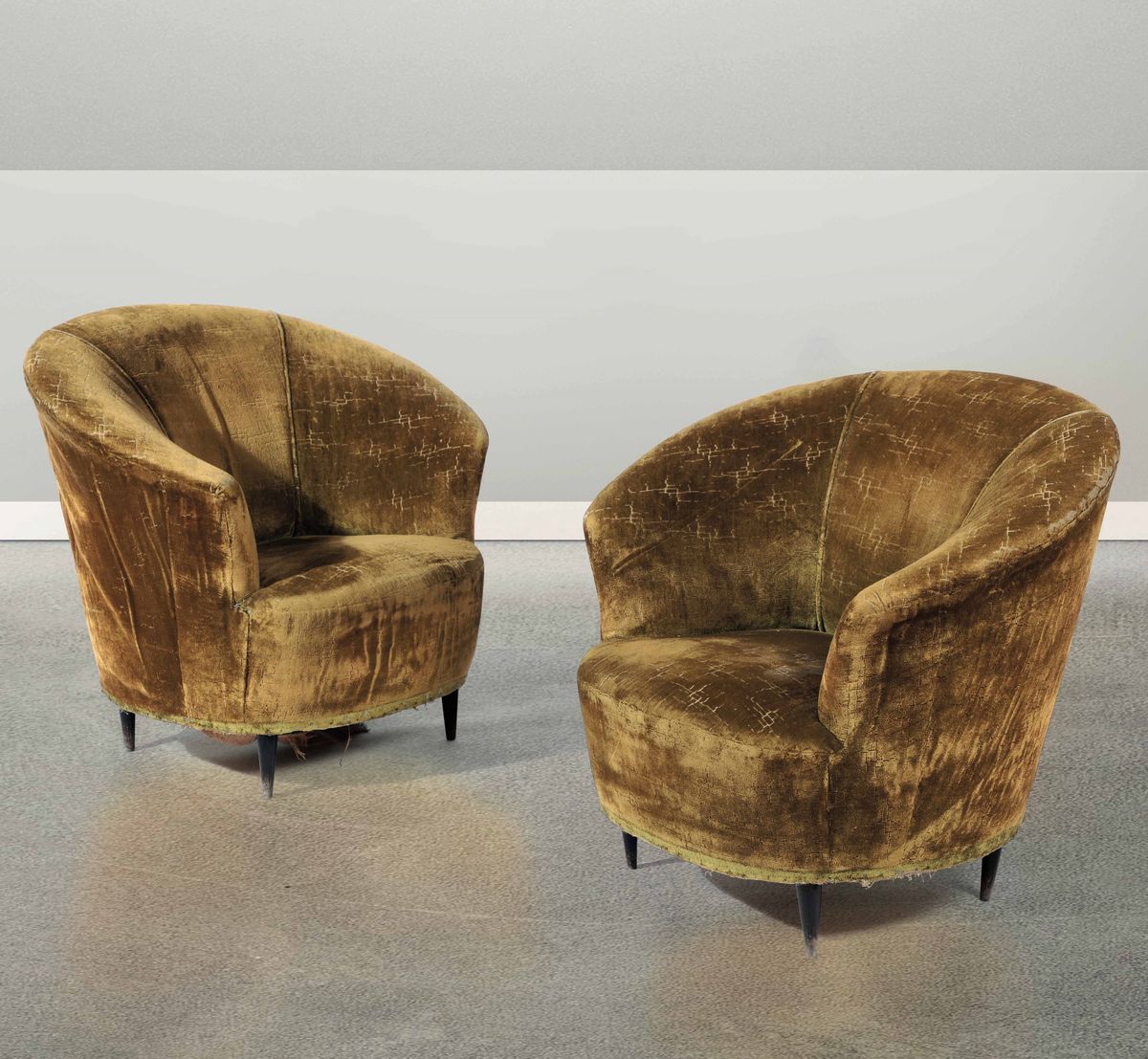 Coppia di poltrone con struttura in legno e rivestimento in velluto.