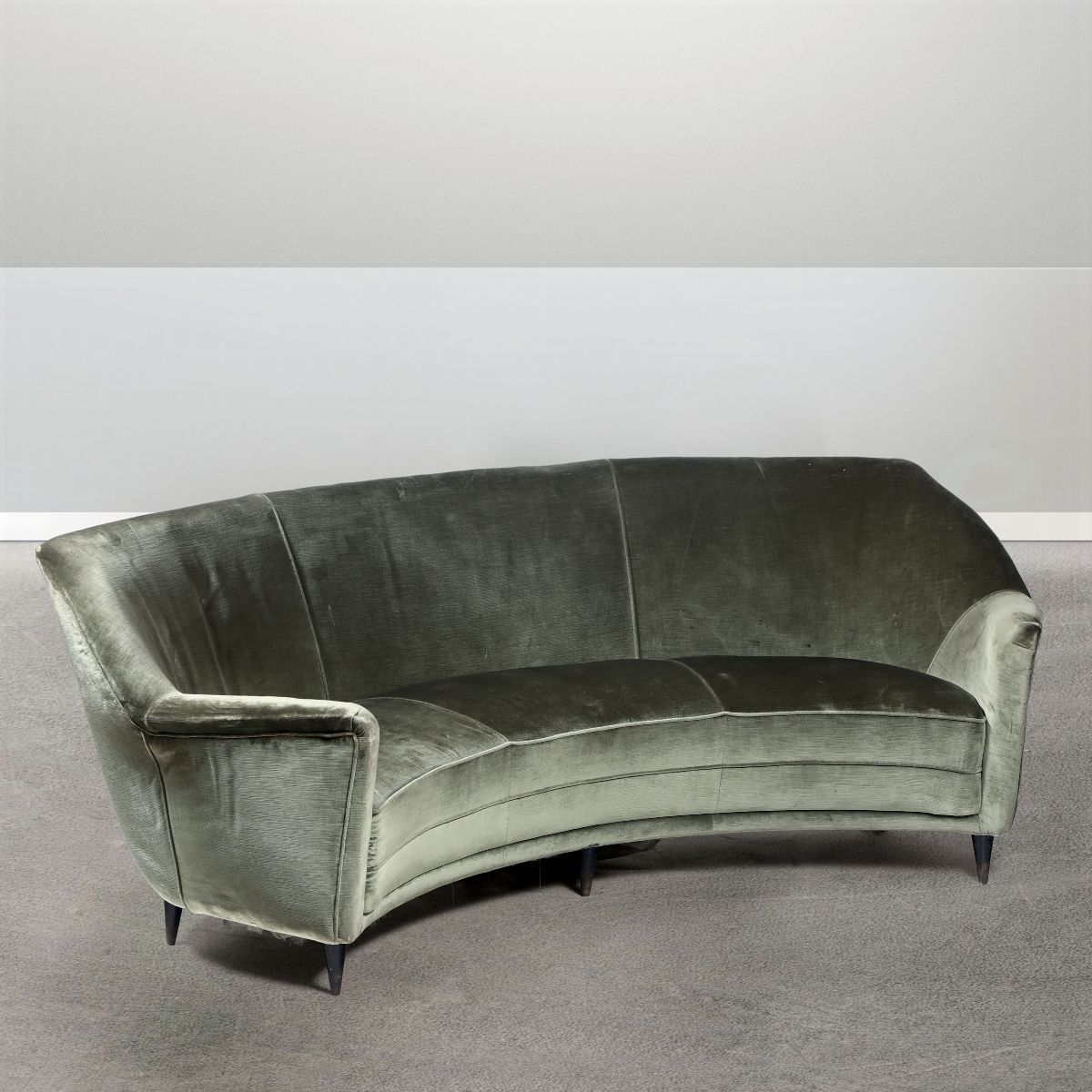 Divano curvo con struttura in legno e rivestimenti in tessuto.