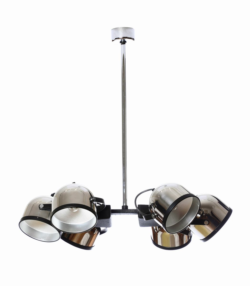 Lampada a sospensione con struttura in metallo cromato.