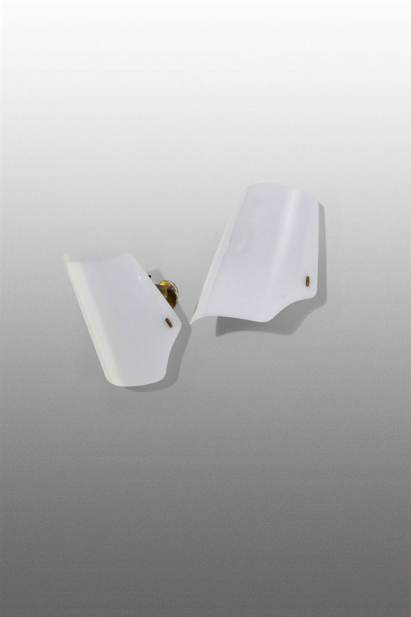 Coppia di lampade da parete mod. 184, struttura in ottone e paralume in metacrilato.