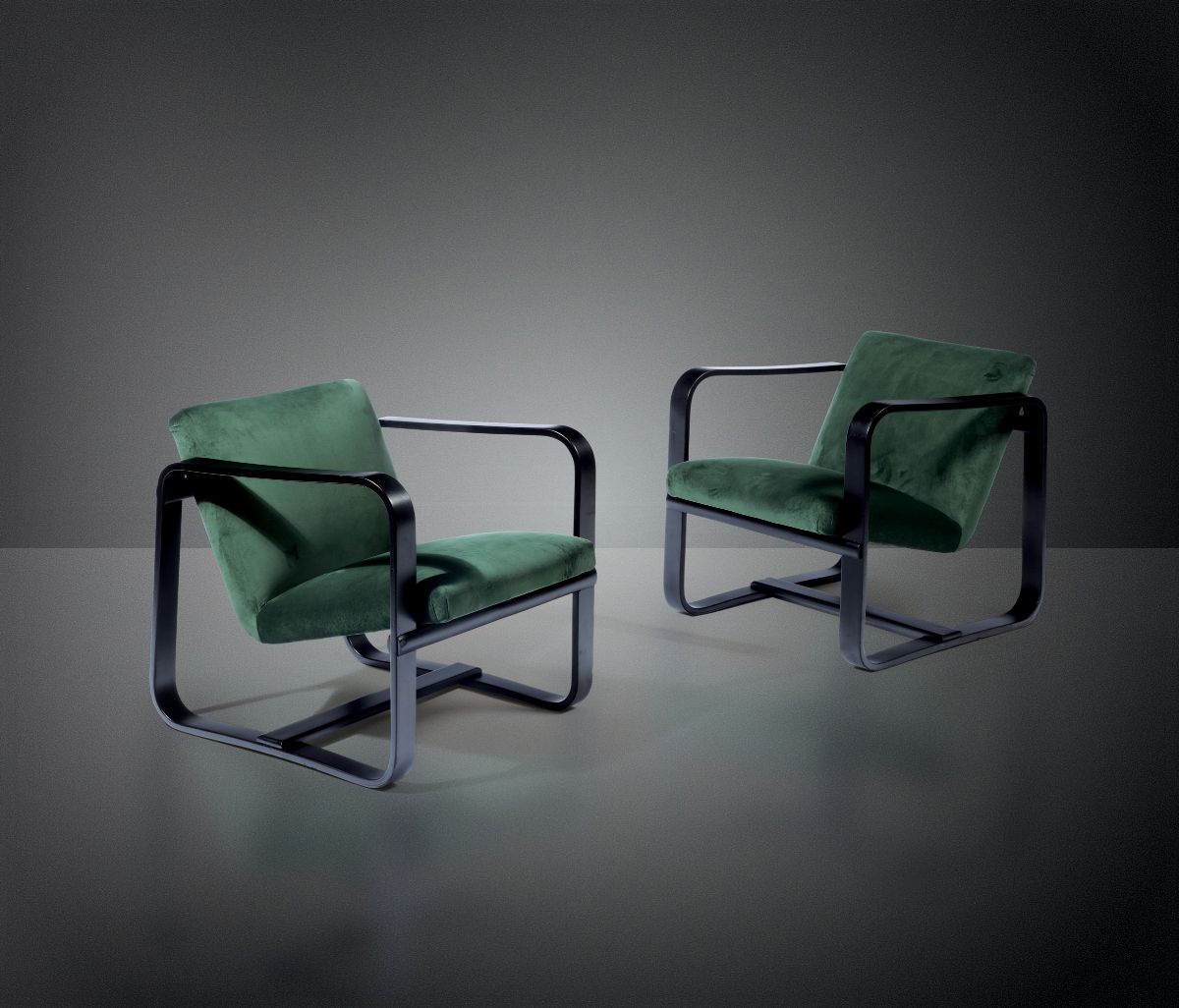 Coppia di poltrone con struttura in legno curvato ebanizzato e rivestimento in tessuto.