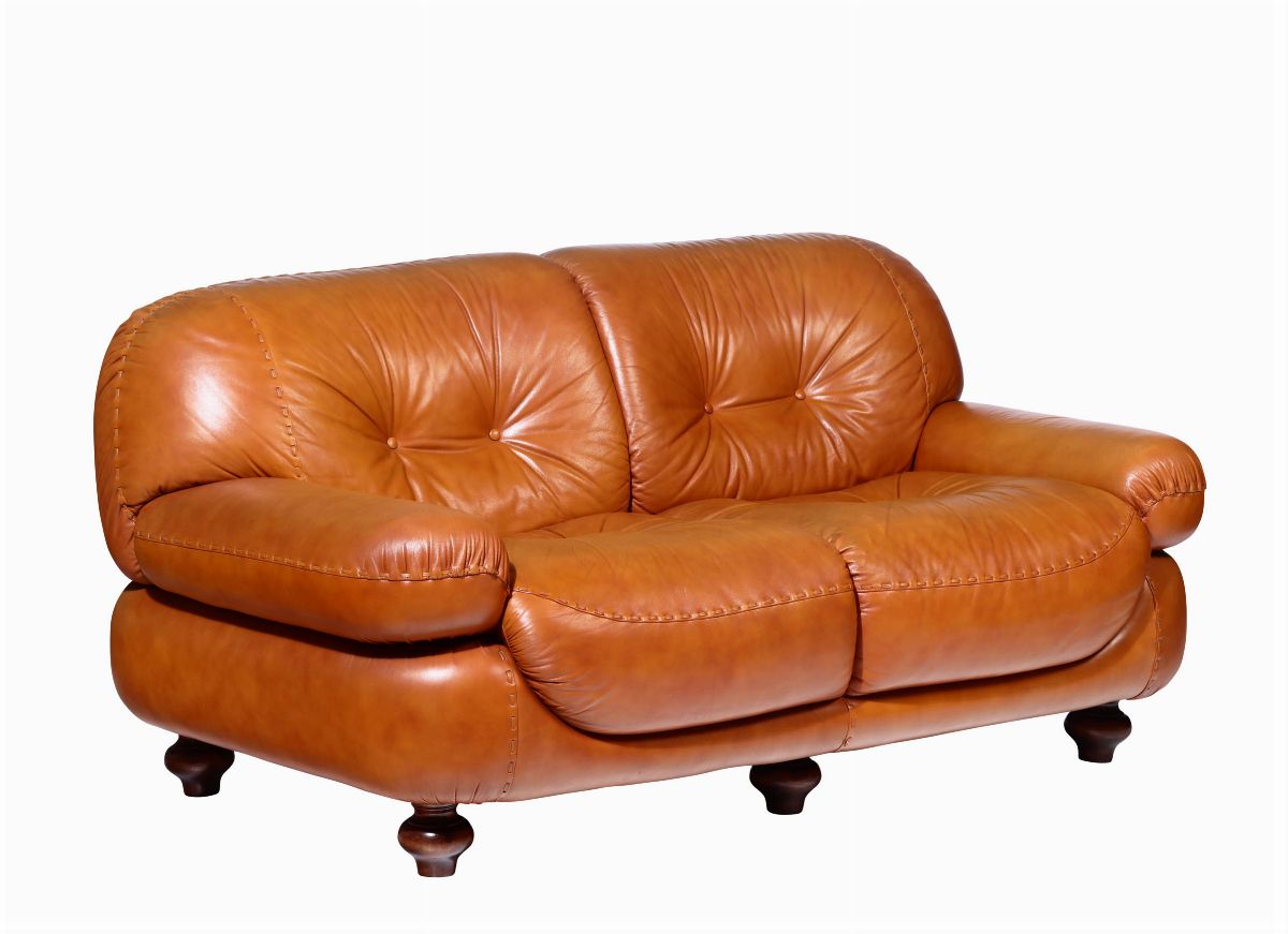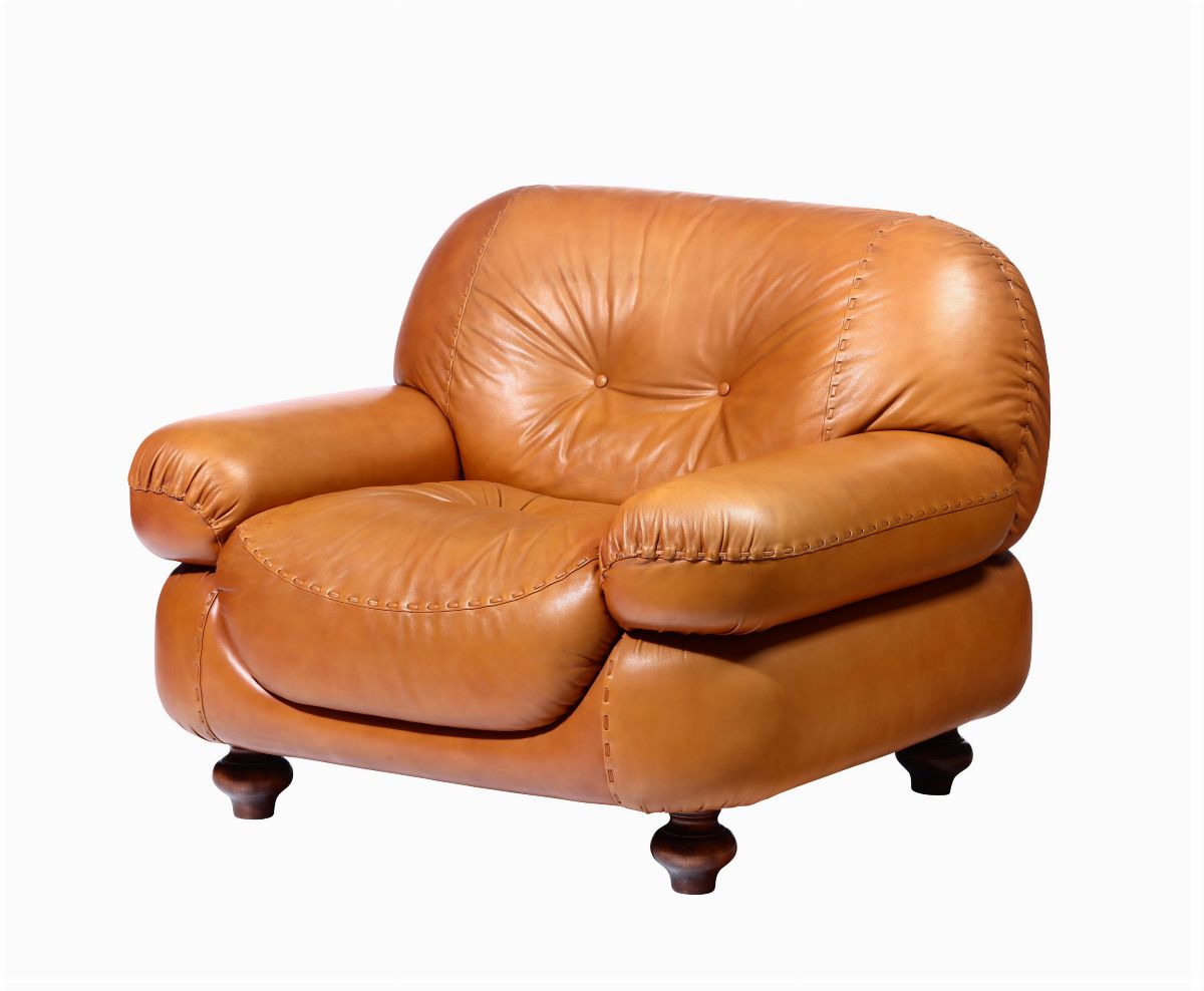 Salotto composto da due divani e una poltrona. Struttura in legno e rivestimenti in pelle.