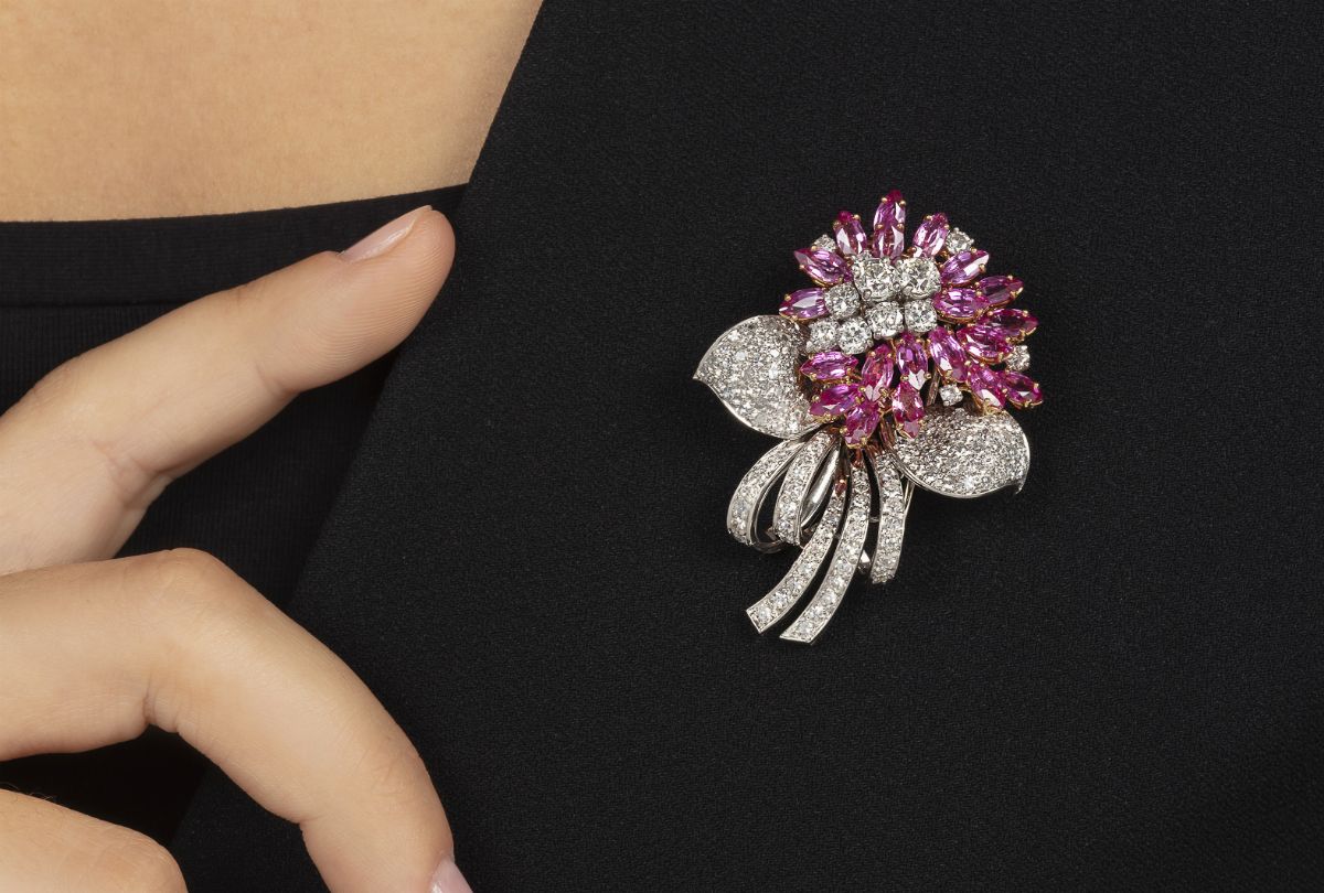 Chaumet Paris. Spilla a soggetto floreale con rubini Burma e diamanti