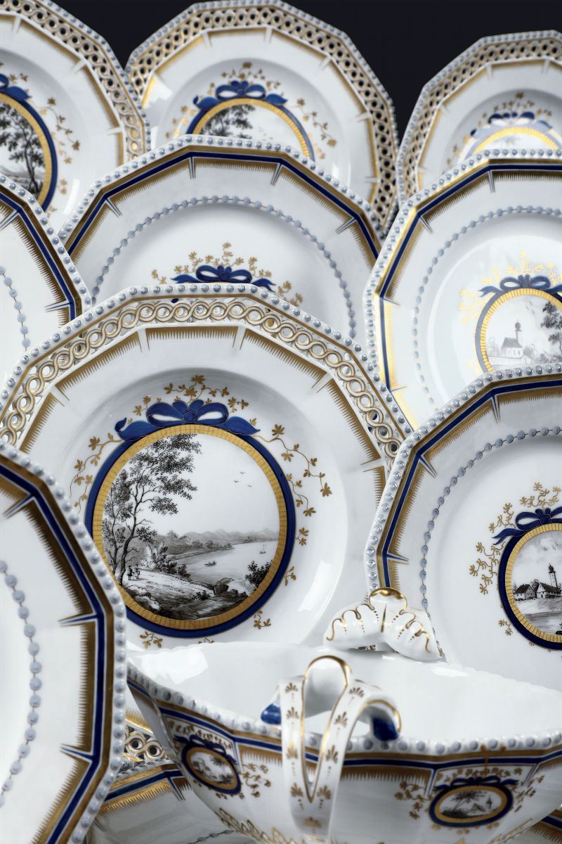 Il servizio per 12 persone è costituito da 90 pezzi ed è così composto: 12 piatti fondi (diam. cm 24,8); 24 piatti piani (diam. cm 24,7); 12 piatti da antipasto (diam. cm 21,5); 10 piatti da dessert con bordo traforato (diam. cm 24,2); 13 tazze da brodo con 11 sottopiatti (alt. tazza cm 6,5; diam. piatto cm 16,5); 1 salsiera (alt. cm 12,5; cm 24 x 17,5); 2 saliere (alt. cm 4,3; 8 x 6); 18 tazze da caffè con piattino (alt. tazza cm 4,8; diam. piattino cm 9,2)