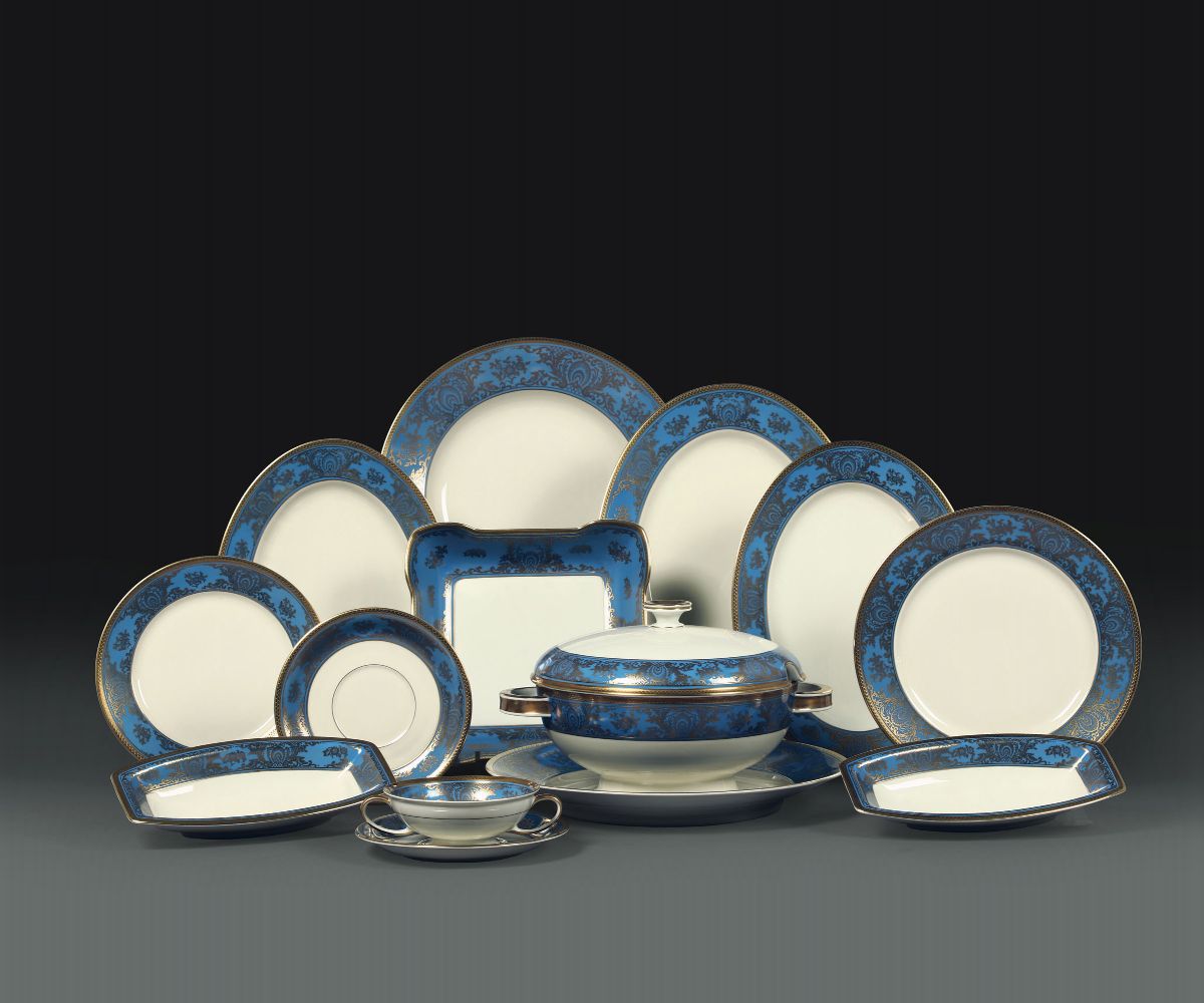 Le porcellane di questo servizio sono decorate ai bordi con un’elegante larga fascia azzurra con motivi vegetali a rocailles