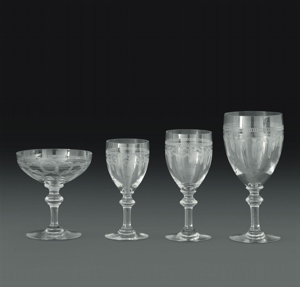 I calici hanno il gambo ornato da una sfera schiacciata mentre le coppe ospitano decorazioni incise all’acido