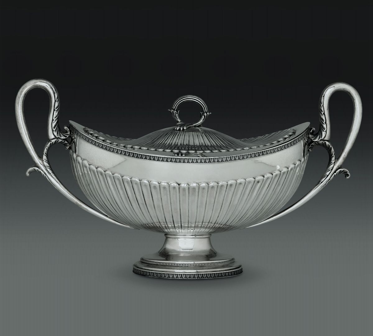 Zuppiera ovale con coperchio in argento primo titolo. Argenteria artistica italiana del XX secolo. Argentiere milanese, [..]