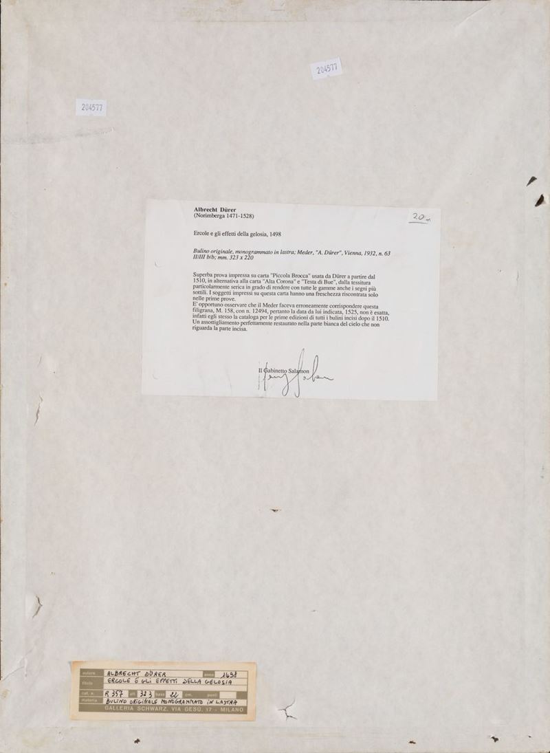 “Superba prova impressa su carta 'Piccola Brocca' usata da Dürer a partire dal 1510, in alternativa alla carta 'Alta Corona' e 'Testa di Bue', dalla tessitura particolarmente serica in grado di rendere con tutte le gamme anche i segni più sottili. I soggetti impressi su questa carta hanno una freschezza riscontrata solo nelle prime prove. (...)"