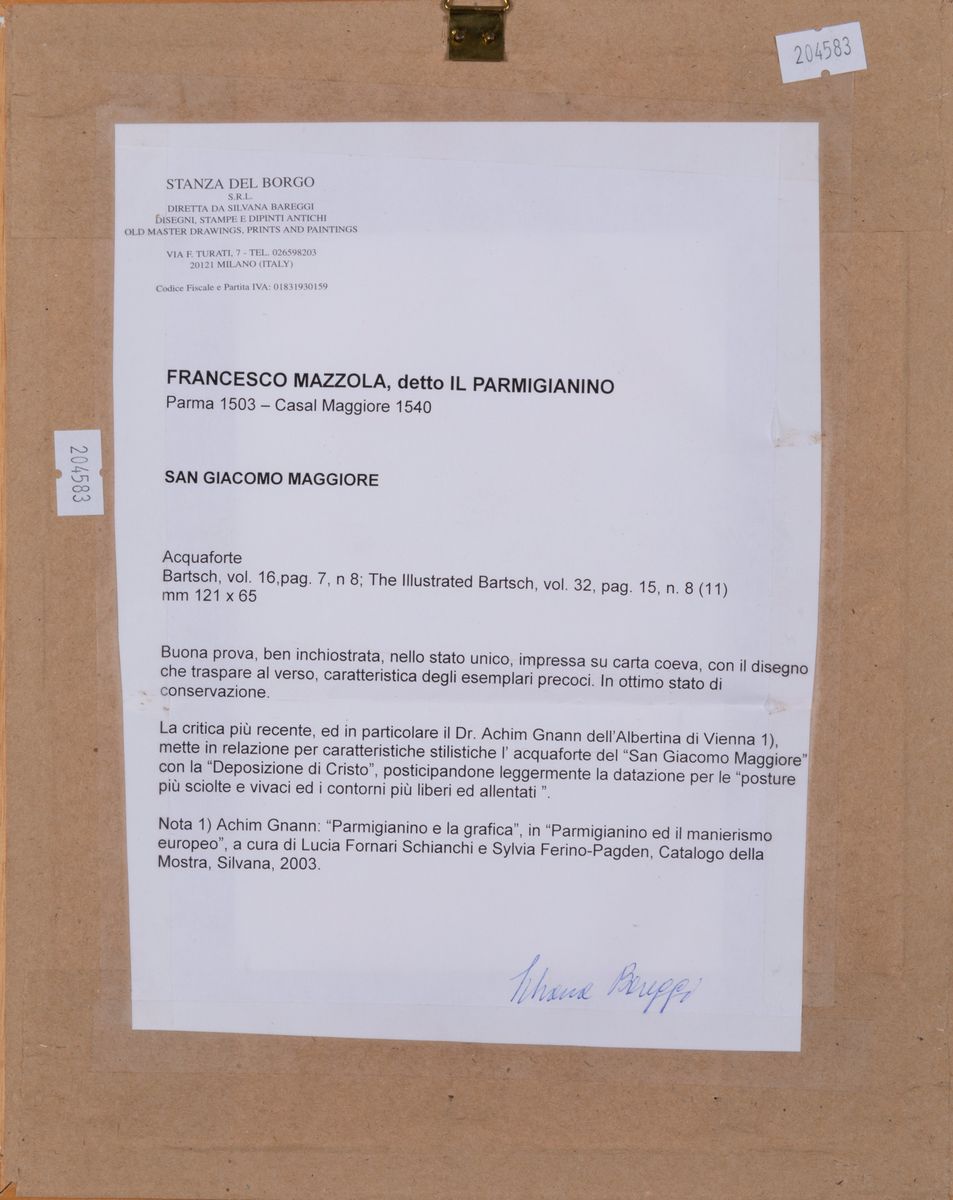 "Buona prova ben inchiostrata, nello stato unico, impressa su carta coeva, con il disegno che traspare al verso, caratteristica degli esemplari precoci. La critica più recente mette in relazione per caratteristiche stilistiche l'acquaforte del 'San Giacomo Maggiore' con la 'Deposizione di Cristo', posticipandone leggermente la datazione per le 'posture più sciolte e vivaci ed i contorni più liberi ed allentati' (...)"