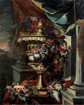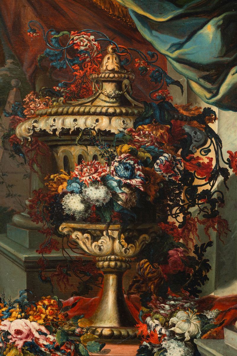 Karel van Vogelaer detto Carlo dei fiori (Maastricht 1653 - Roma 1695), attribuito a Natura morta con vaso di fiori e drappi [..]