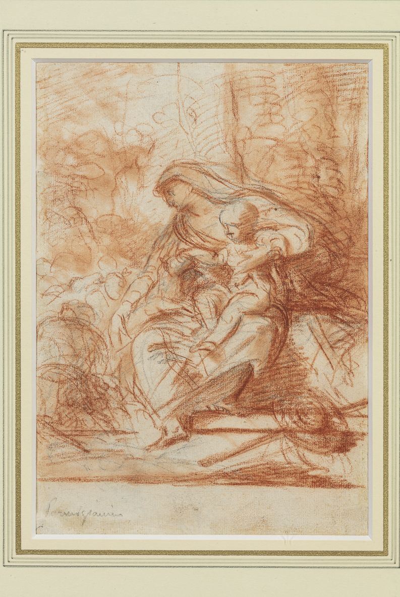 "Il nostro studio è un tipico esempio dell'arte grafica di Mola sia per l'uso della sanguigna acquerellata che per i tratti rapidi e incrociati, la semplificazione dei volti e il modo di rendere il paesaggio sullo sfondo. Richard Cocke data il disegno al 1659 c. e lo accosta, per l'uso del gesso rosso, ai fogli 'Studi per San Giuseppe' del Museo Nazionale di Capodimonte a Napoli, 'Studi per la Vergine e il Bambino' della Collezione P. Rosenberg di Parigi. Cocke suggerisce inoltre che il nostro disegno possa essere una prima idea per il dipinto di Leningrado 'Il riposo dalla fuga in Egitto', databile al 1659 ca. e quindi una ulteriore interessante acquisizione destinata ad ampliare il corpus dei fogli, ora citatati, in relazione con la tela dell'Hermitage."
