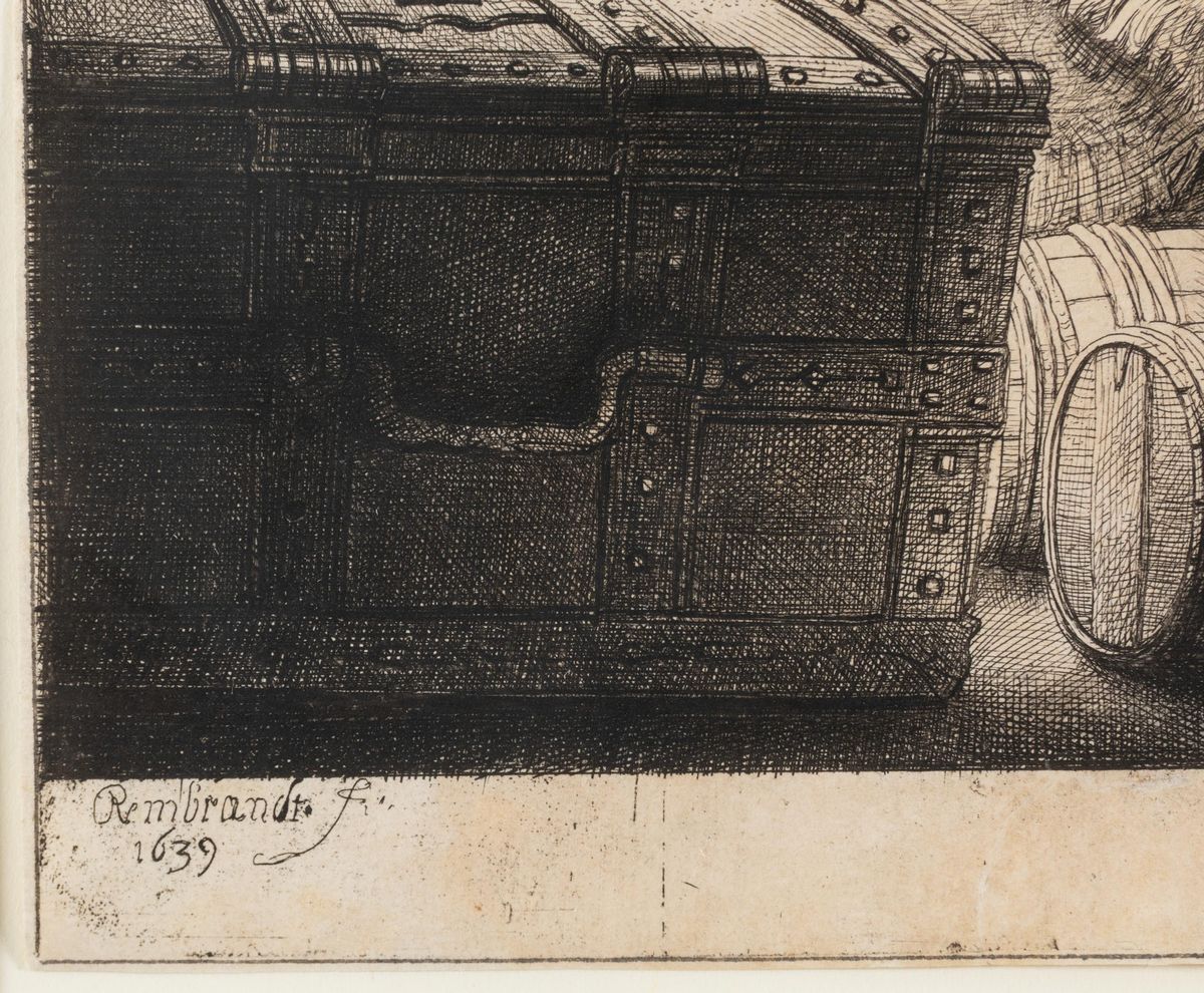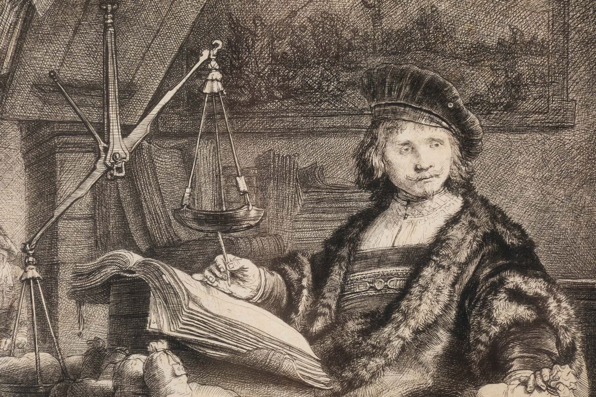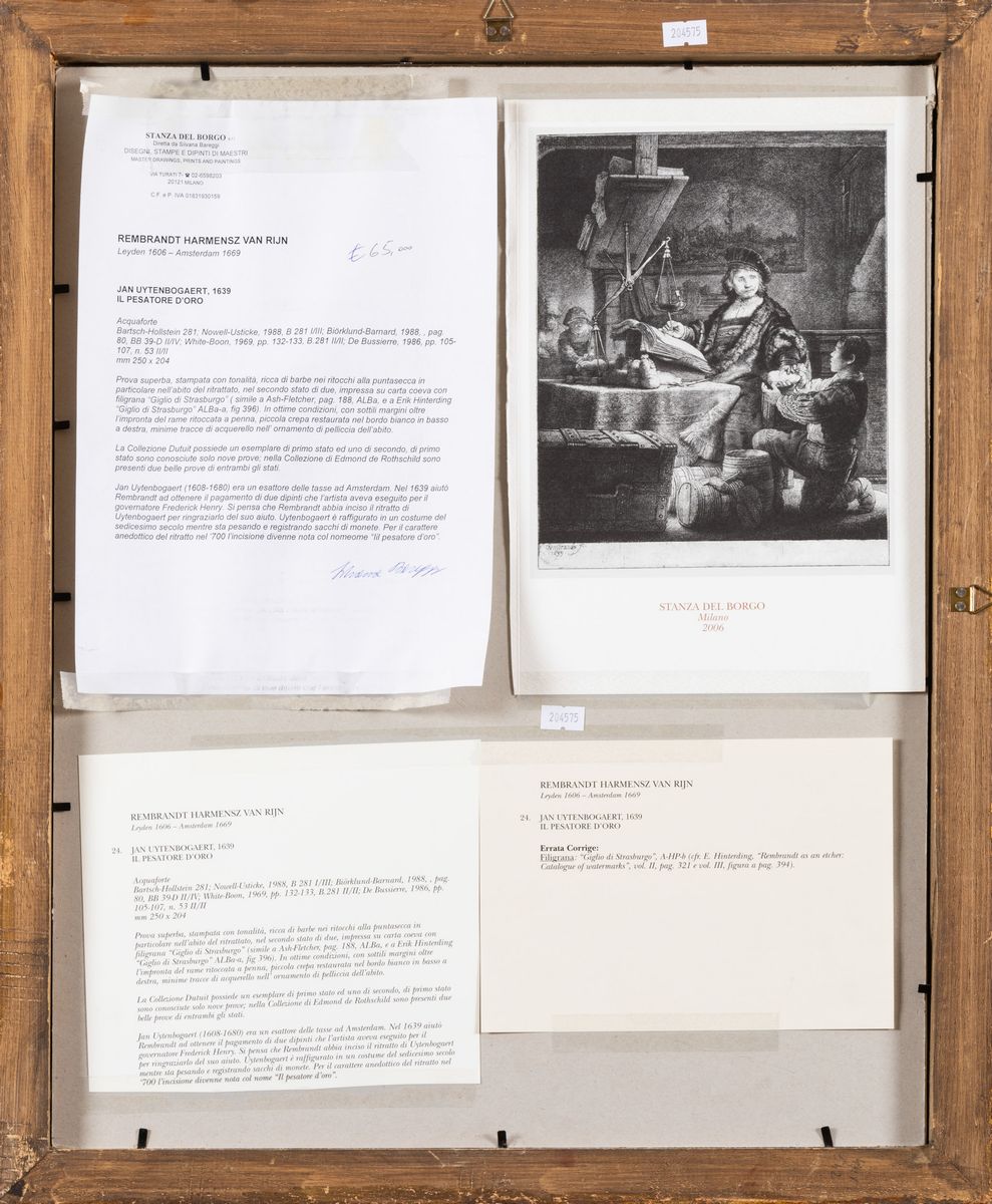 "Jan Uytenbogaert (1608-1680) fu un esattore delle tasse ad Amsterdam. Nel 1639 aiutò Rembrandt a ottenere il pagamento per due dipinti che l'artista aveva eseguito per il governatore Frederick Henry. Si pensa che Rembrandt abbia inciso il ritratto di Uytenbogaert per ringraziarlo del suo aiuto. Uytenbogaert è raffigurato nell'atto di pesare e registrare sacchi di monete e, per il carattere anedottico del ritratto, nel Settecento l'incisione divenne nota con il nome de 'il pesatore d'oro'."