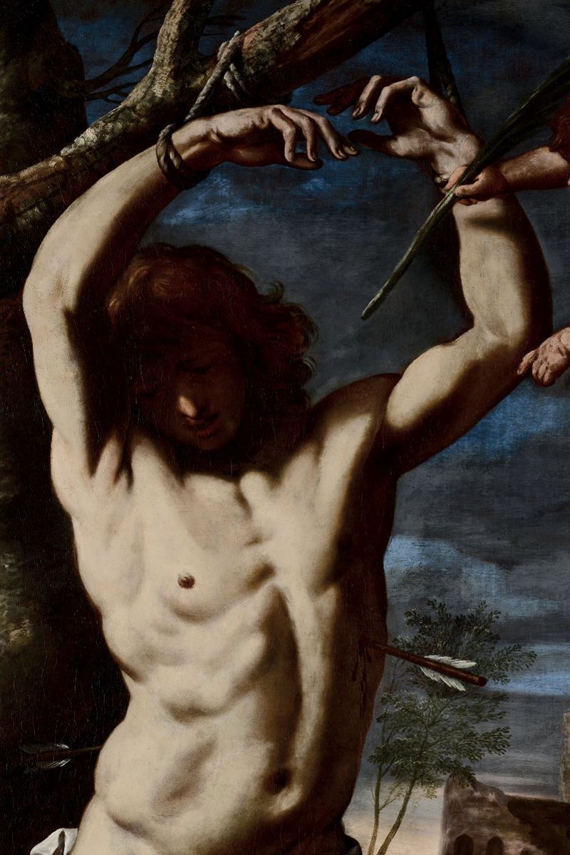 La dolente e virtuosistica rappresentazione del nudo maschile del santo martire inginocchiato nel corrusco paesaggio pare quasi una esemplare sintesi di esperienze ed incontri occorsi all’artista nelle sue peregrinazioni fra Pesaro, Bologna e Roma: da Giovanni Francesco Guerrieri a Giuseppe Puglia, ad Alessandro Turchi detto l’Orbetto; oltre a Reni, naturalmente.