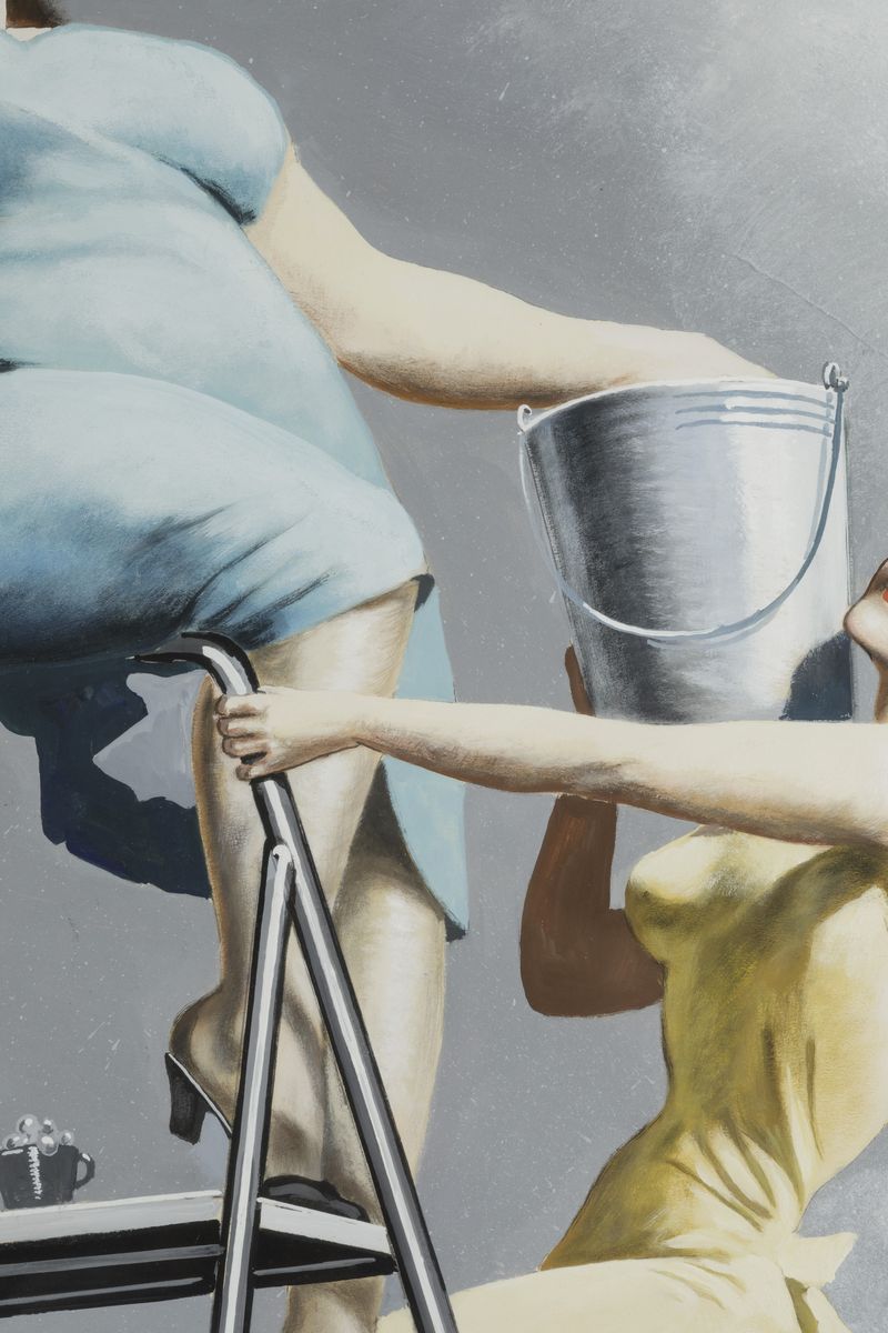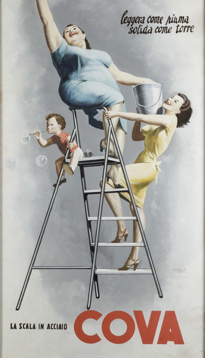 Dipinto pubblicitario scala in acciaio Cova Milano, primi anni'50. Tempera su cartone cm 73x124 ca,firmata a destra.