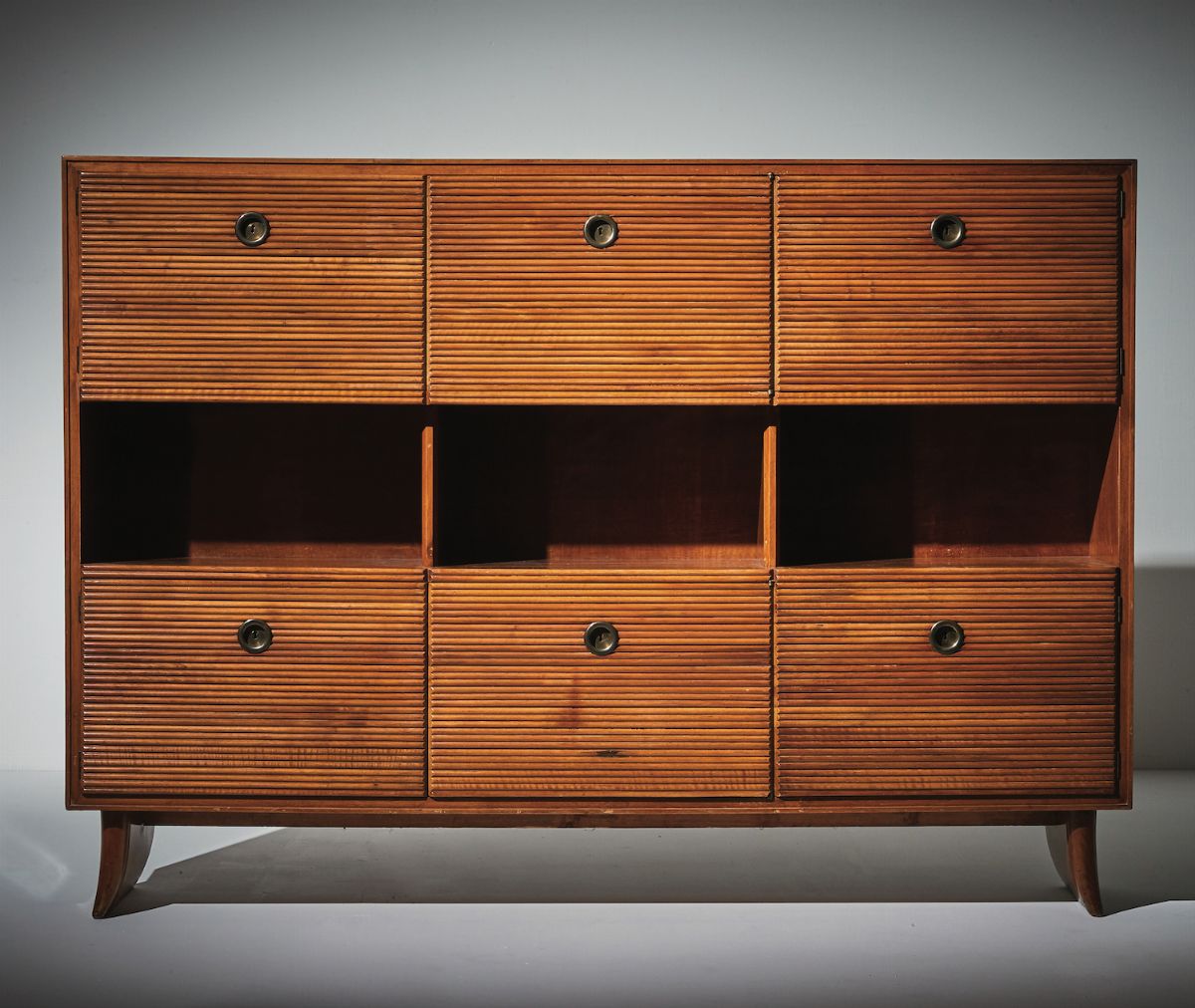 Credenza in legno con rivestimenti in legno grissinato. Dettagli in ottone.