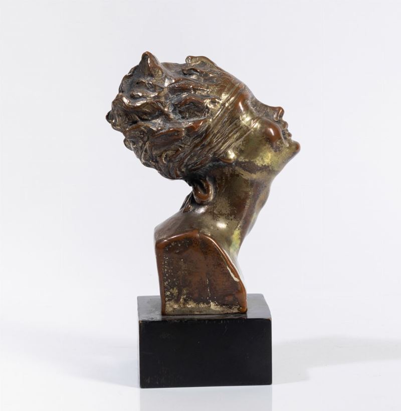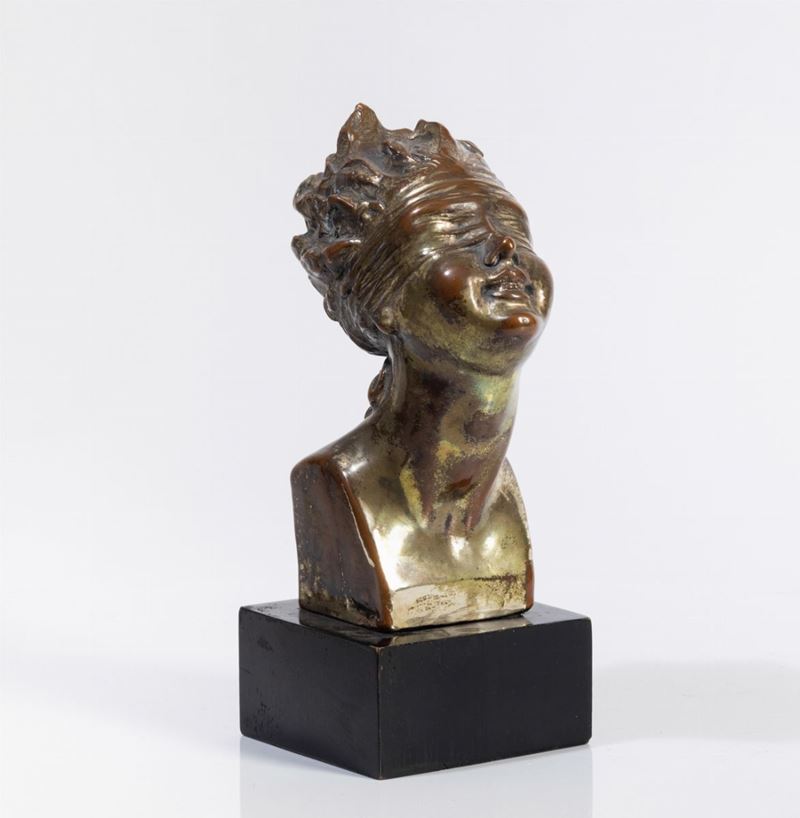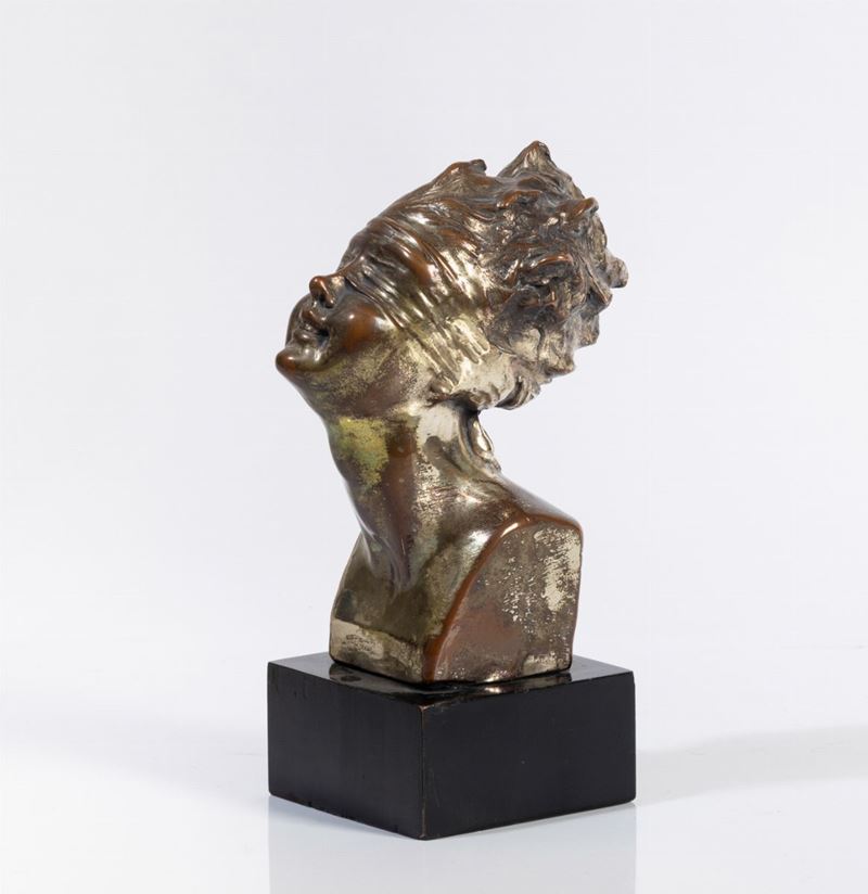 Testa della Fortuna in terraglia modellata a colaggio, superficie interamente argentata. Basamento in legno laccato.