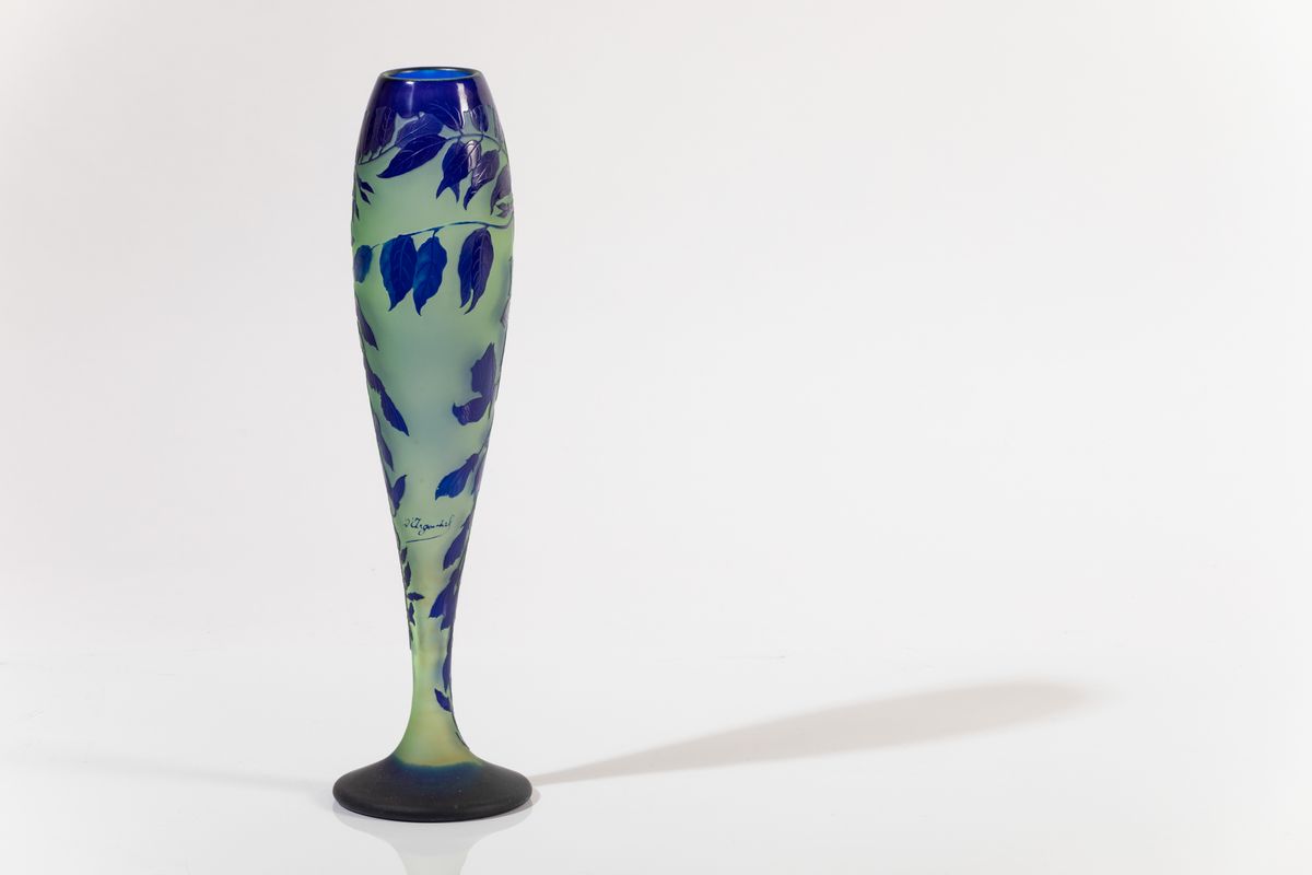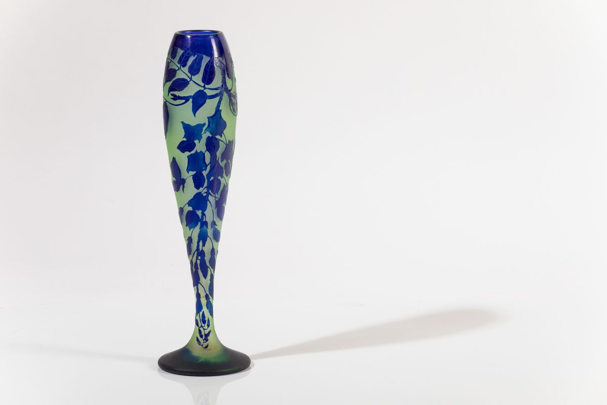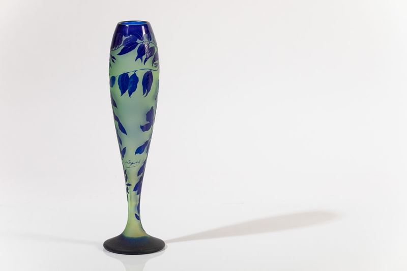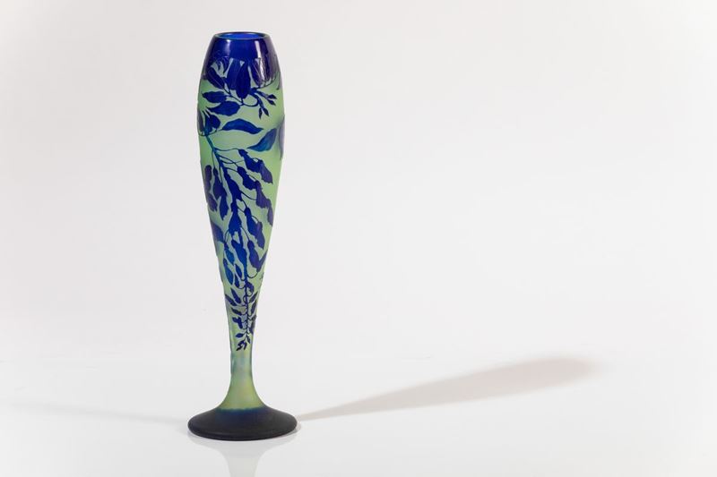 Vaso a goccia rovesciata in vetro a cammeo con decoro di glicine.