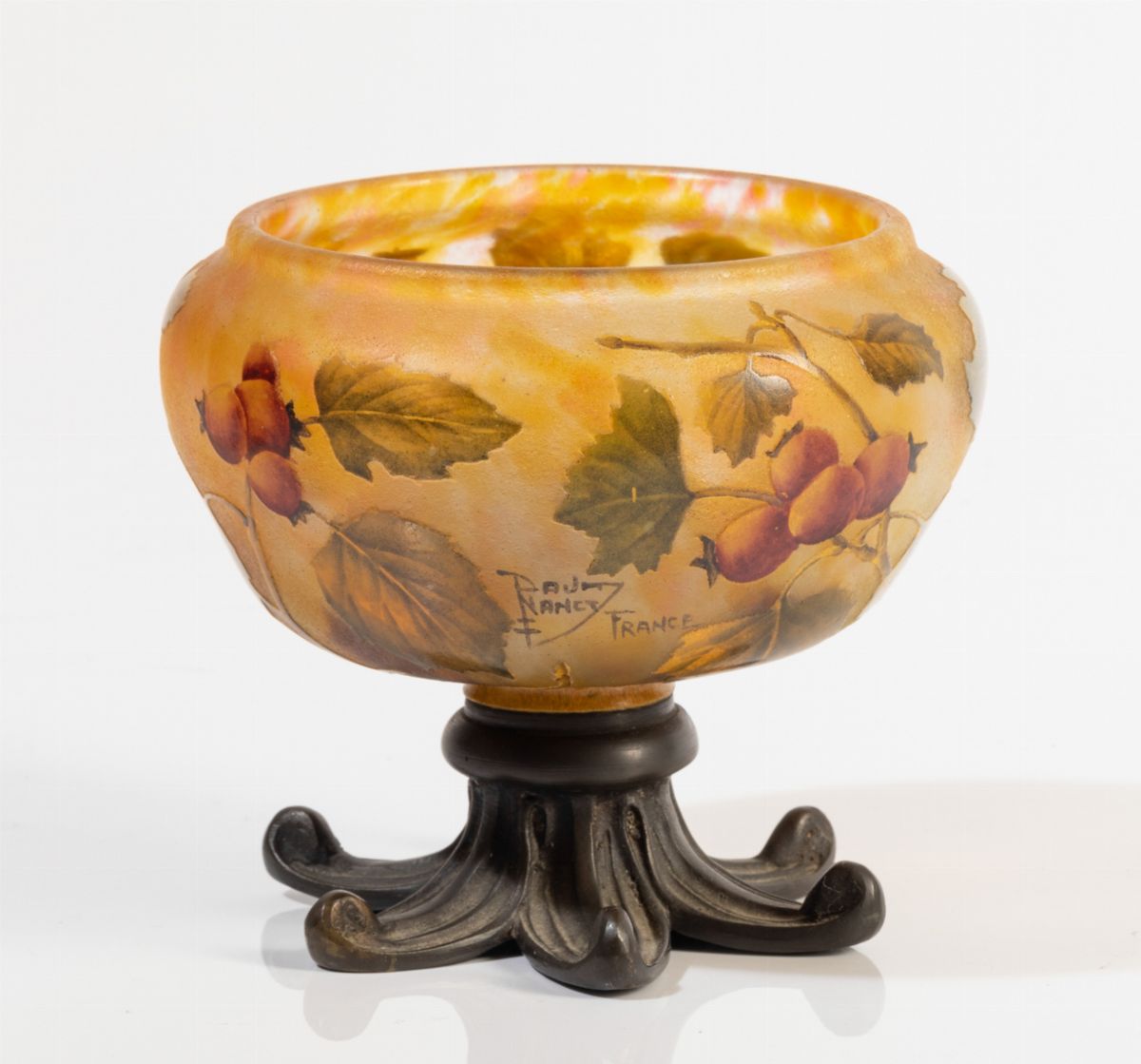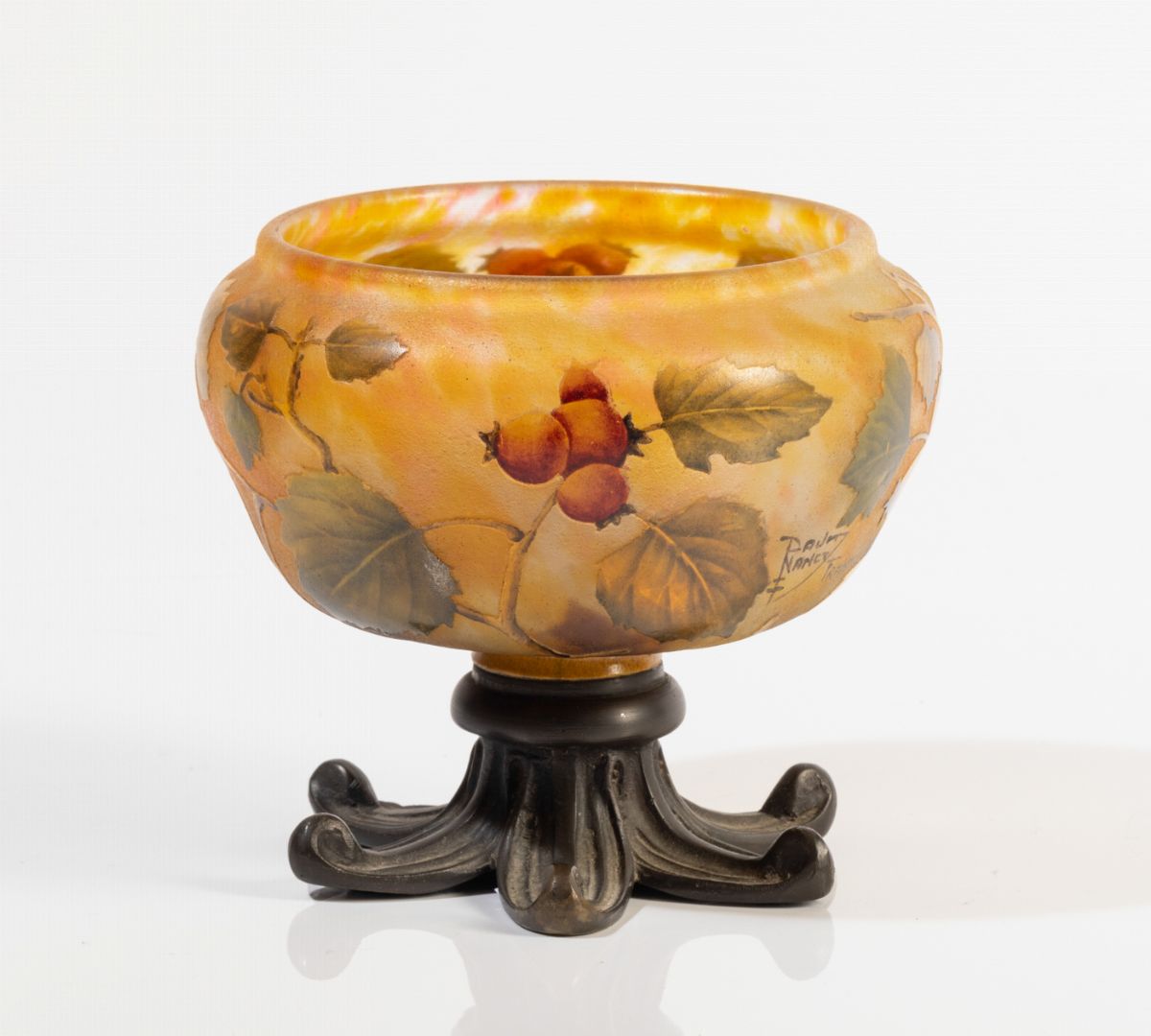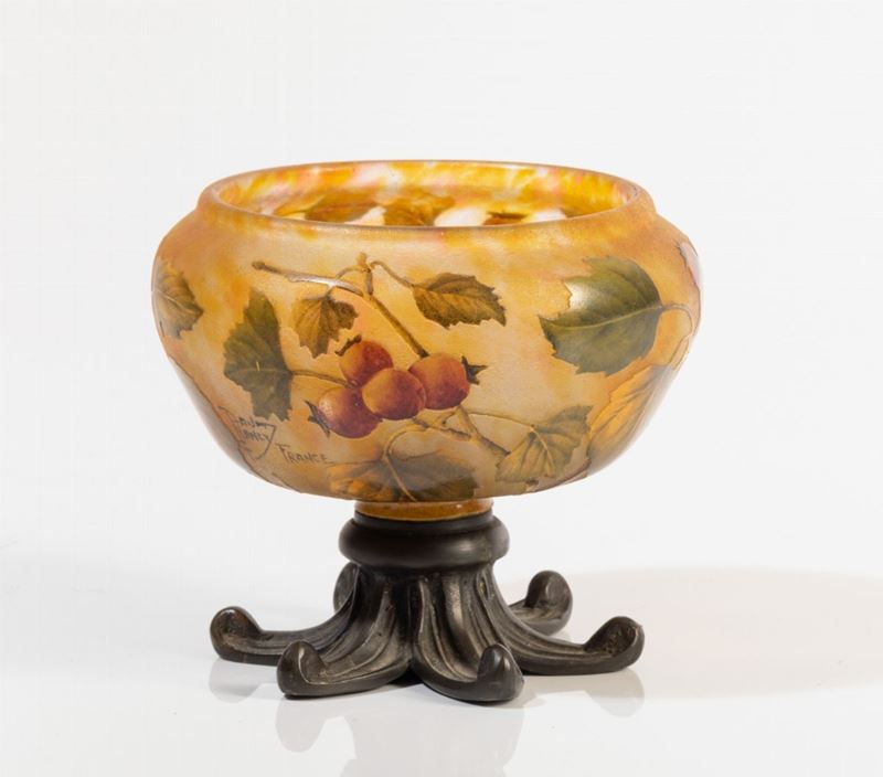 Vaso globulare in vetro a cammeo con decoro di foglie e bacche su basamento in bronzo.