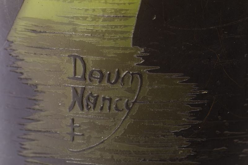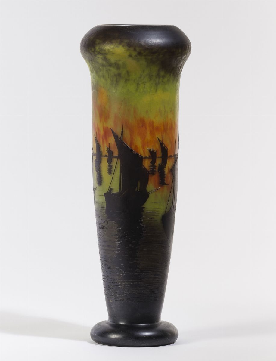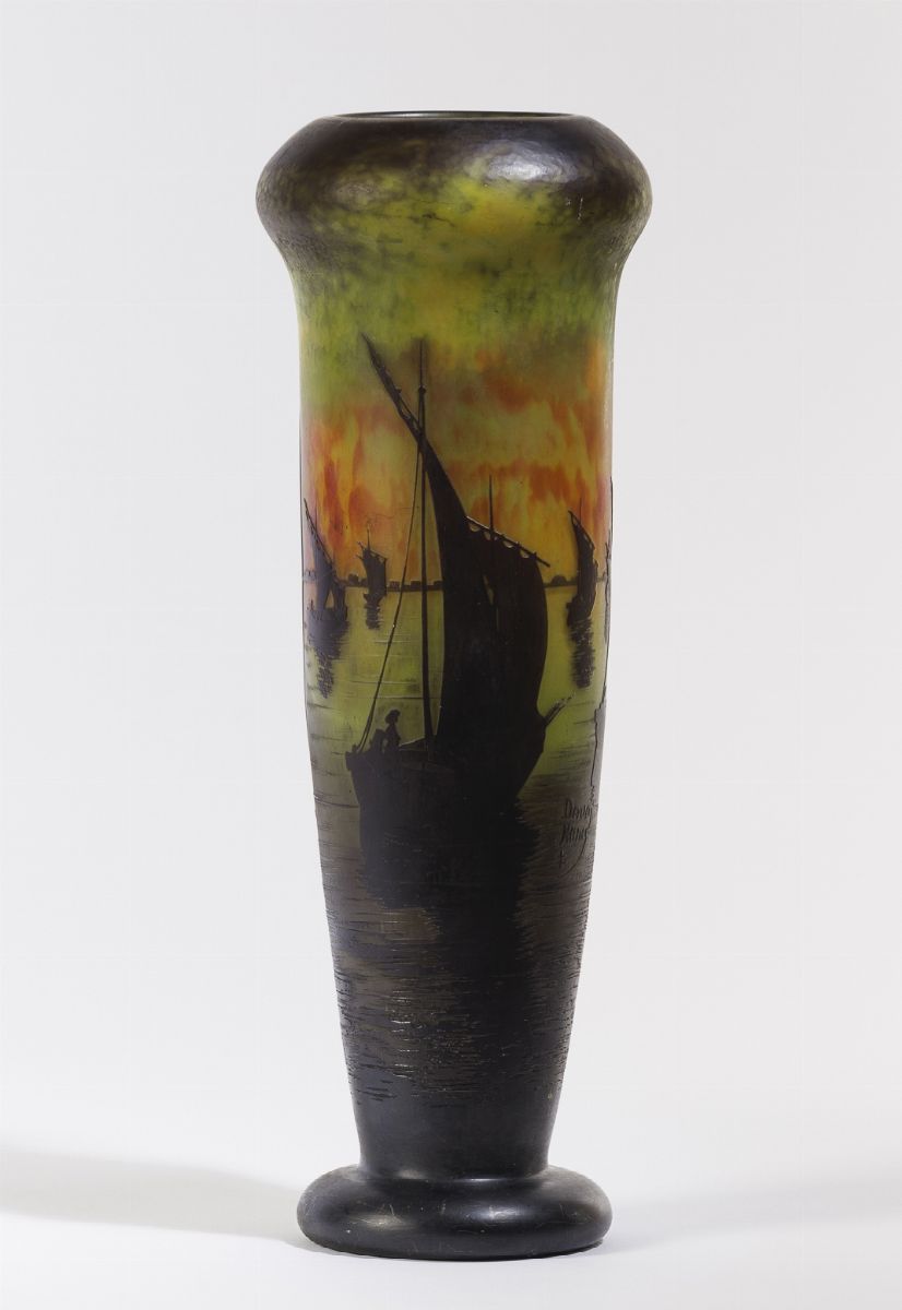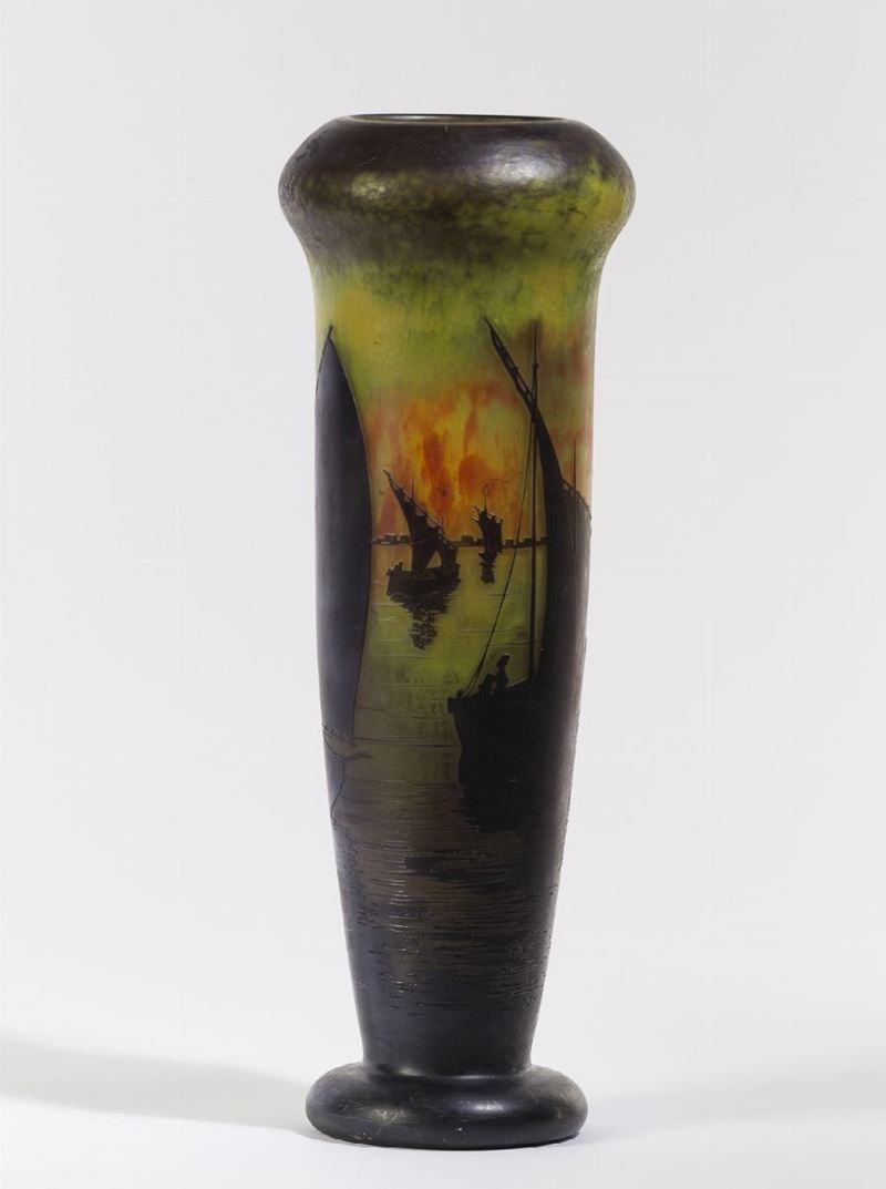 Grande vaso a balaustro in vetro a cammeo con decoro di barche al tramonto.