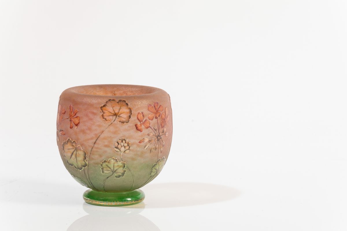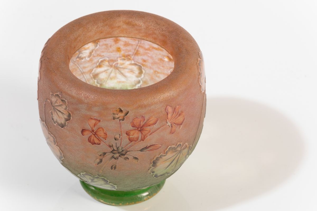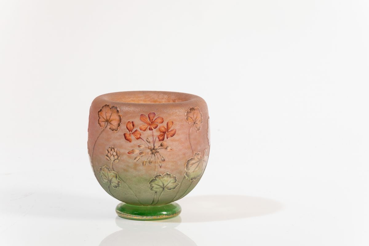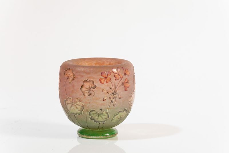 Vaso a bocca introflessa in vetro soffiato con decoro a cammeo e smalti di gerani.