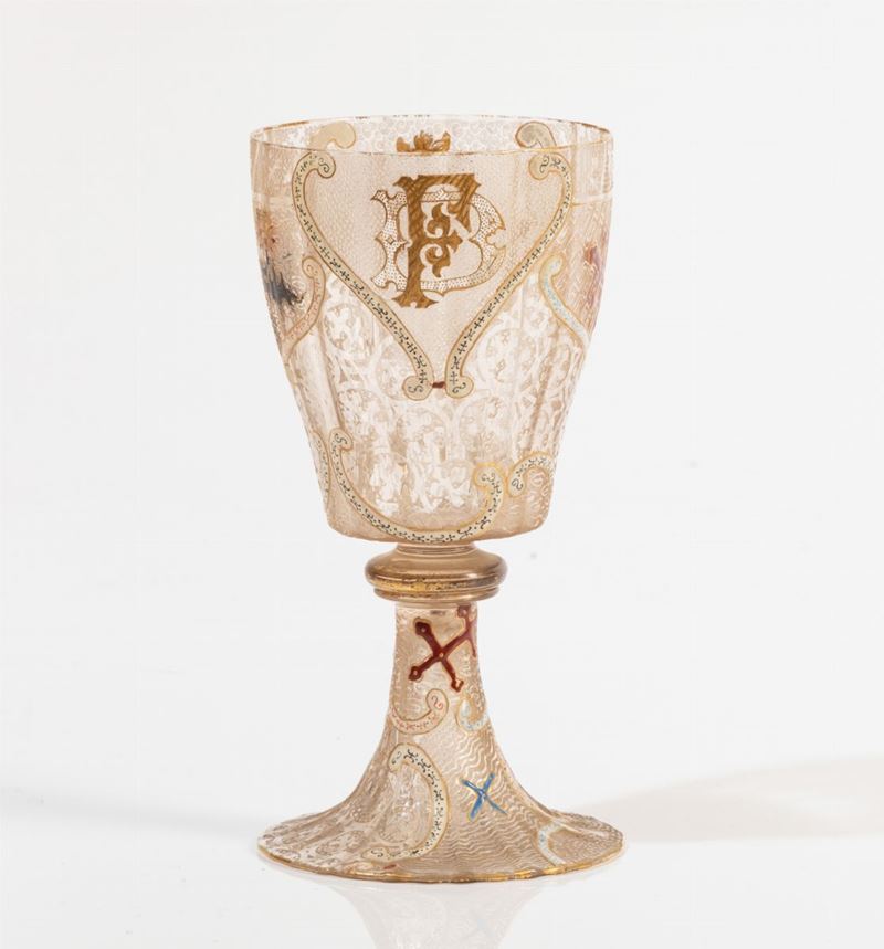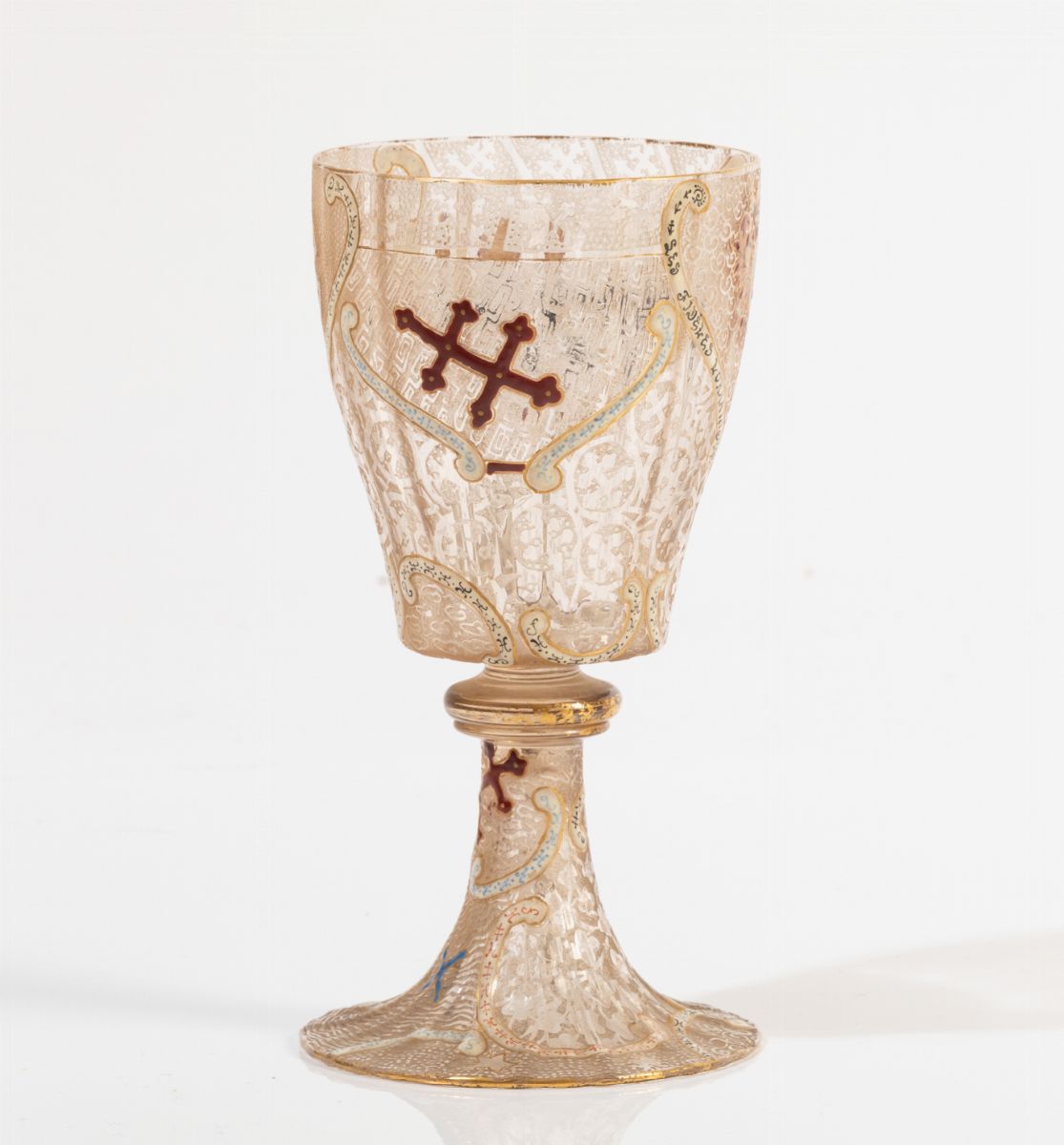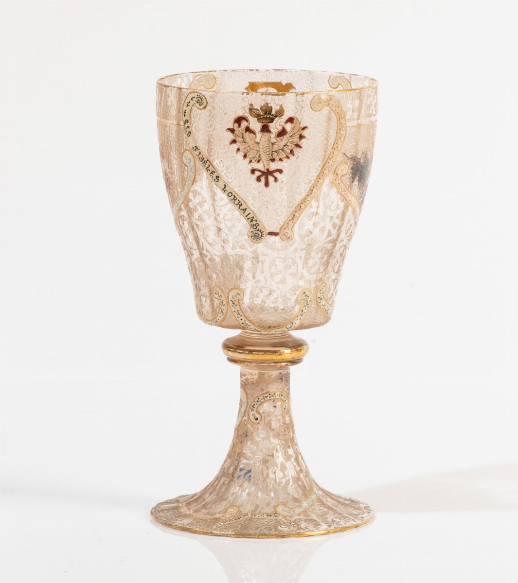 Raro bicchiere commemorativo in cristallo soffiato con decoro a cammeo, incisioni, dorature e iniziali con croce di Lorena a smalto.