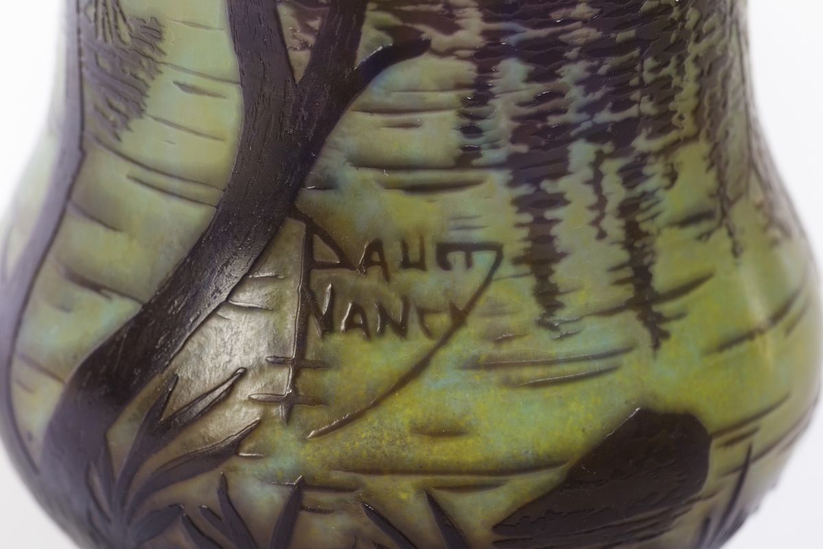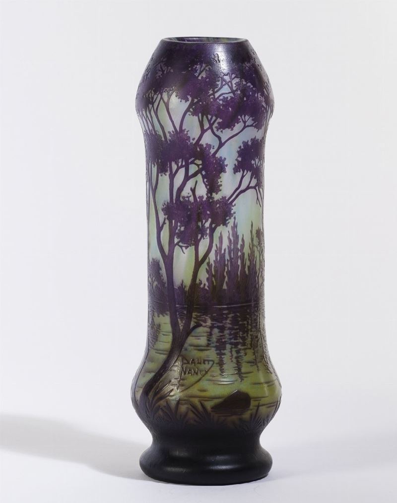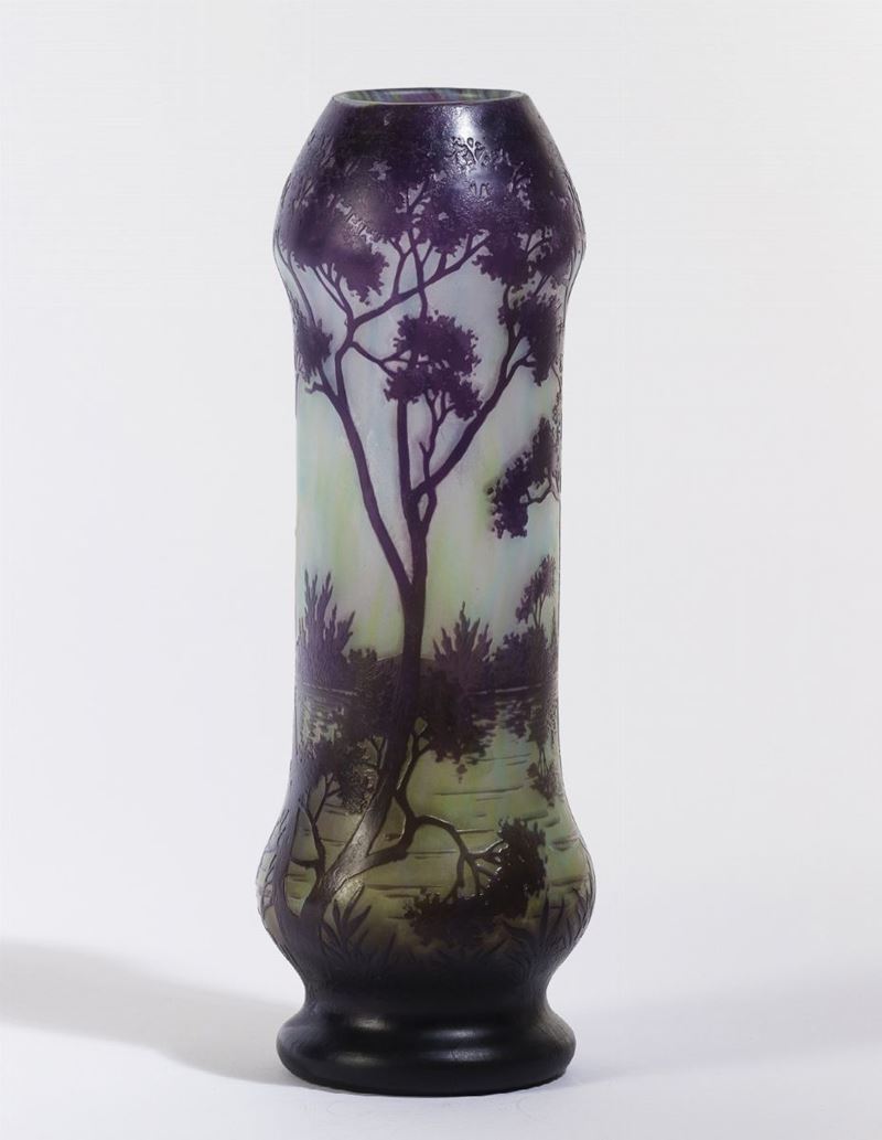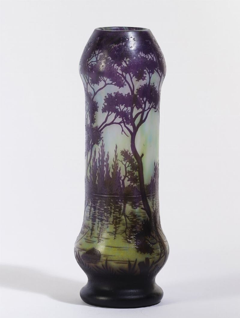 Vaso a balaustro in vetro a cammeo con decoro di paesaggio lacustre e alberi.