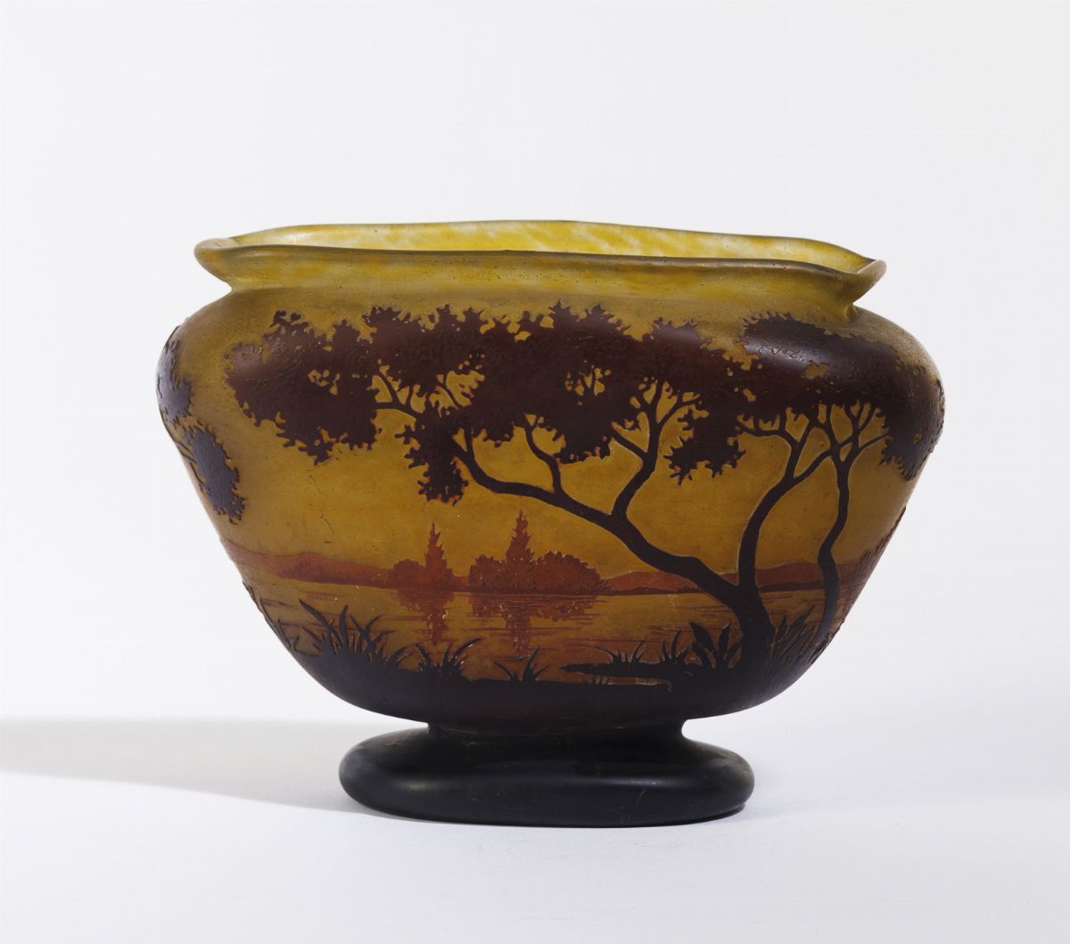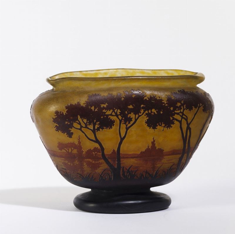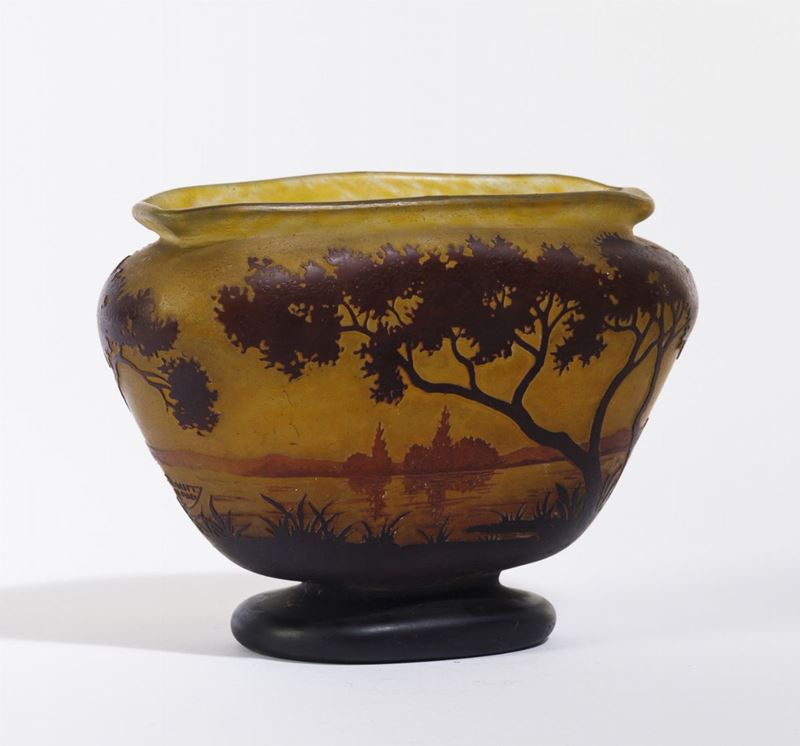 Vaso troncoconico schiacciato in vetro a cammeo con decoro di paesaggio lacustre.