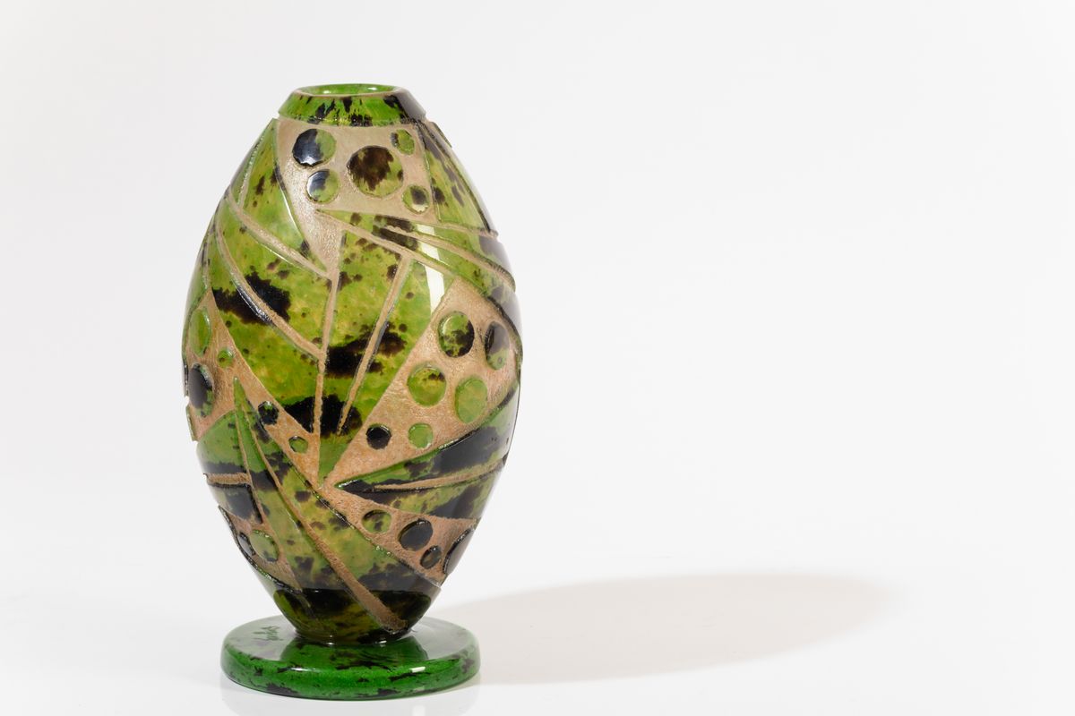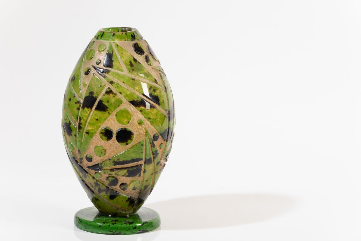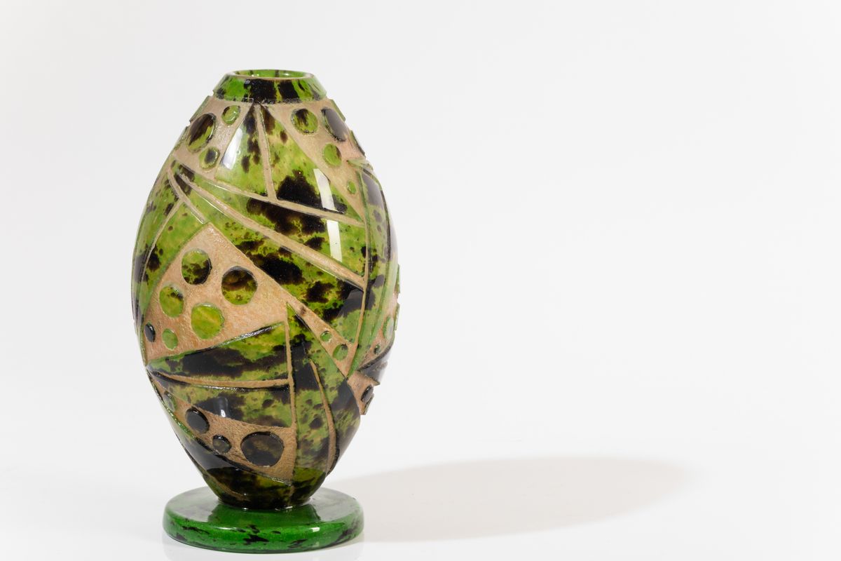 Vaso a uovo su piede circolare in vetro a cammeo con decoro astratto policromo.