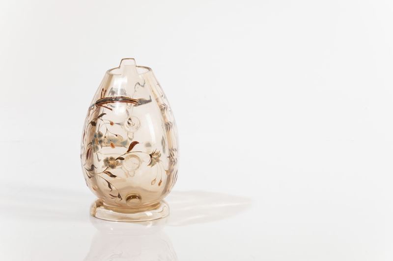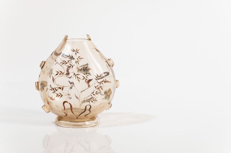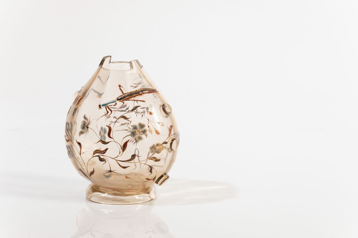 Raro vaso a fiasca in cristallo soffiato con piede, anse e collo molati con decoro di mantide religiosa e rami floreali in smalto a rilievo e dorature.