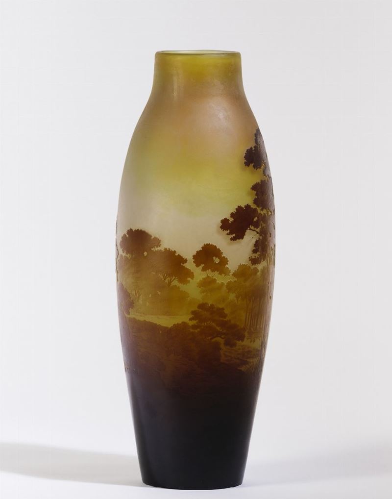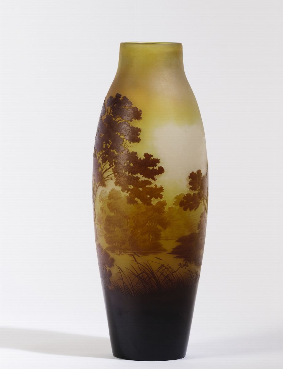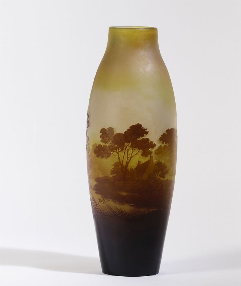 Grande vaso a balaustro in vetro a cammeo con decoro di paesaggio lacustre con casa e alberi.