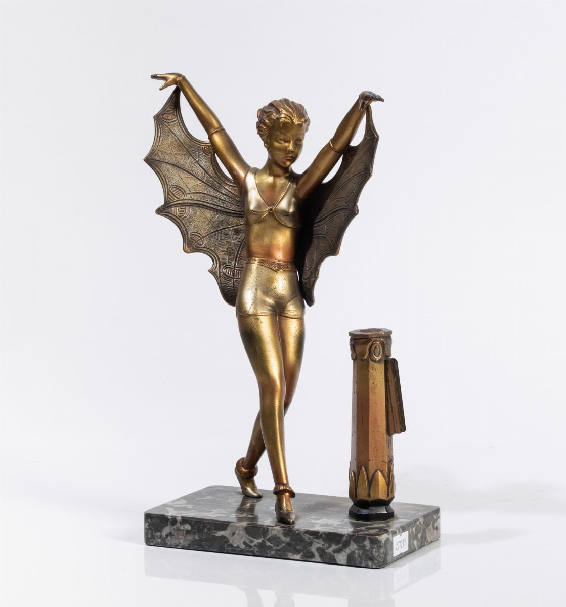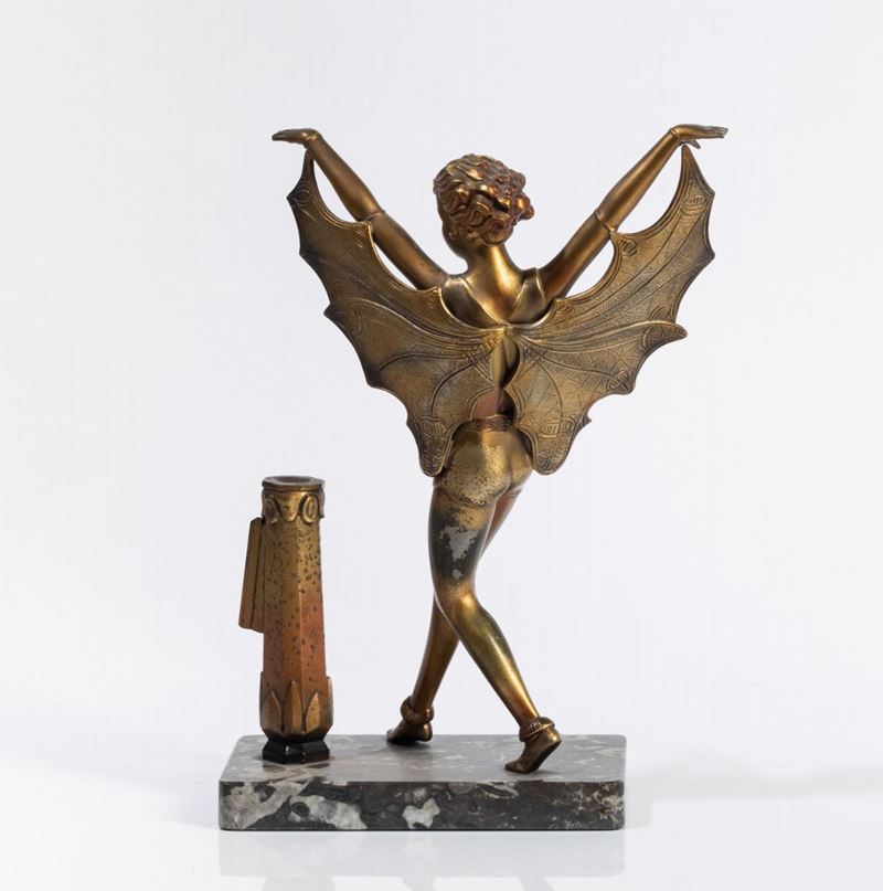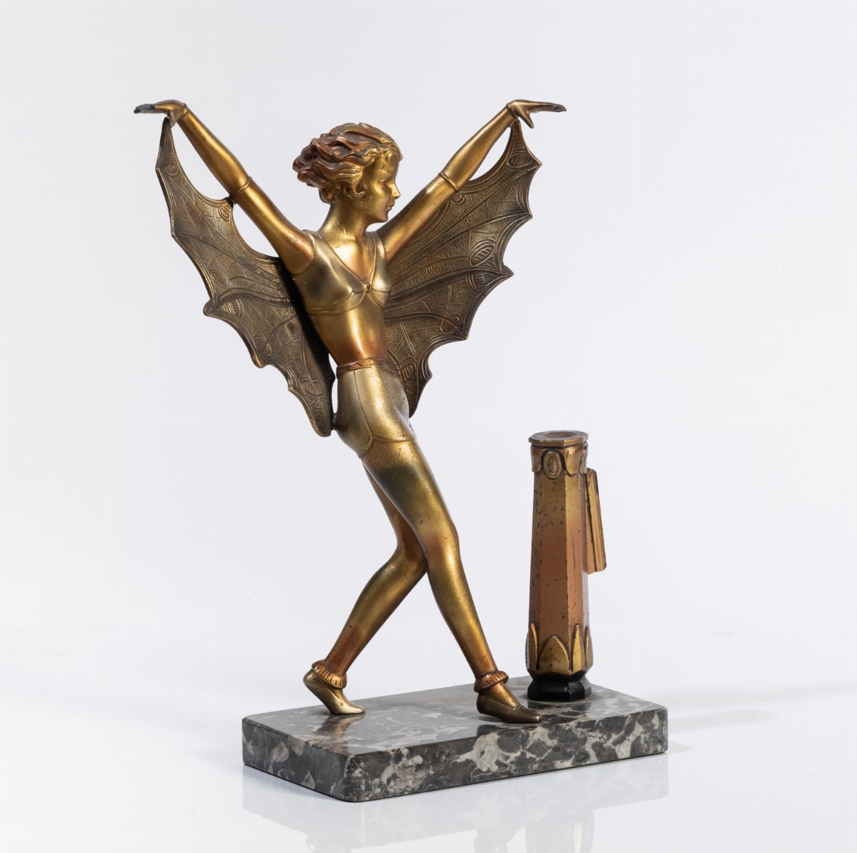 Calamaio in forma di danzatrice con colonnina in lega metallica su basamento in marmo.