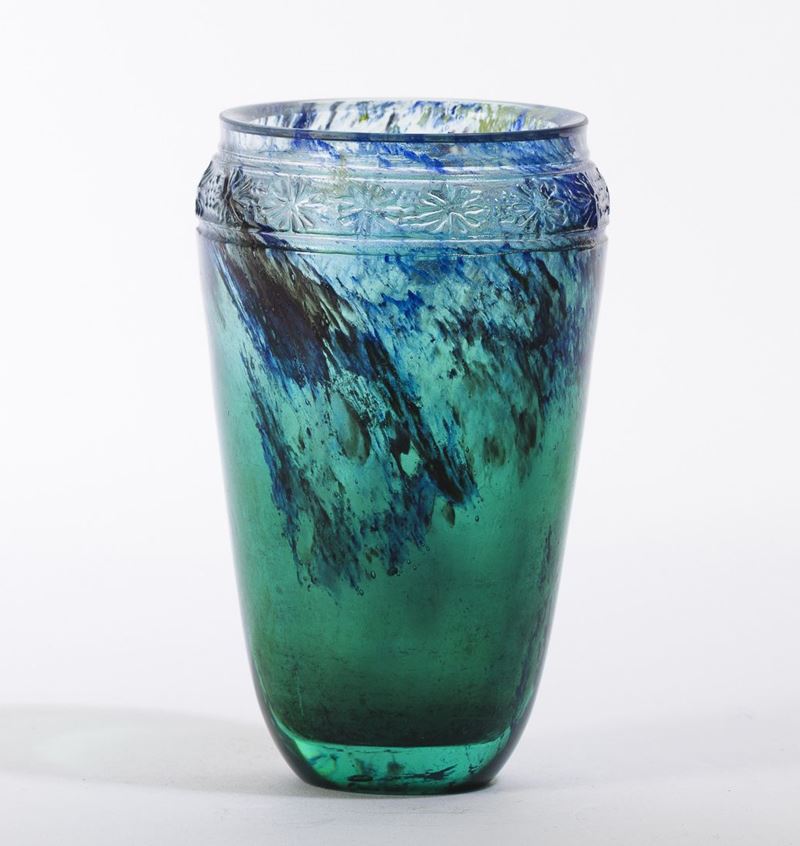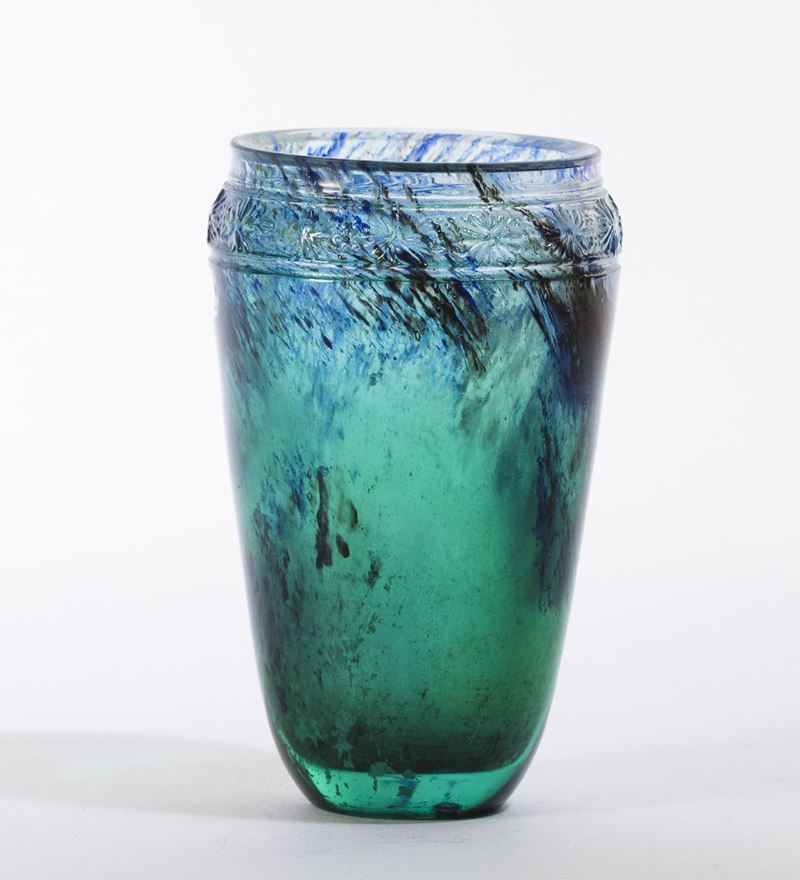 Vaso in vetro soffiato in stampo con decoro di fascia floreale.
