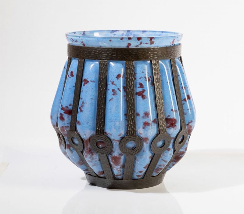 Grande vaso in vetro multicolore soffiato in forma di ferro lavorata.