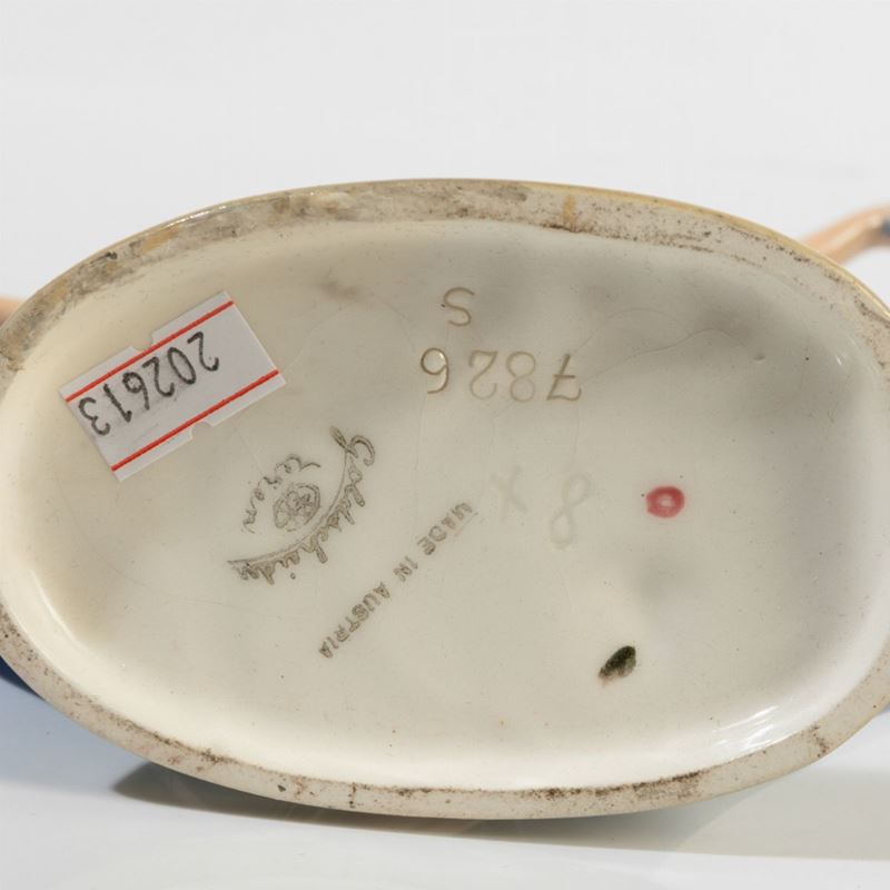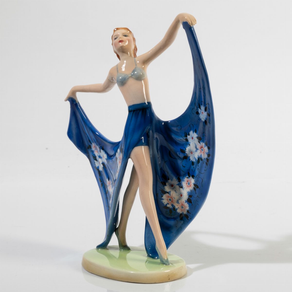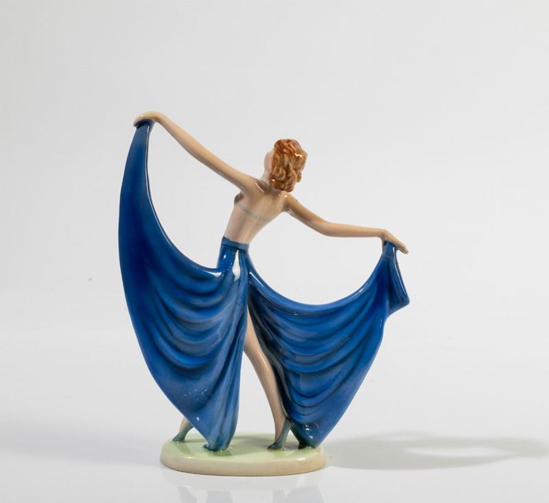 Figura di ballerina in terraglia a colaggio con decoro policromo.