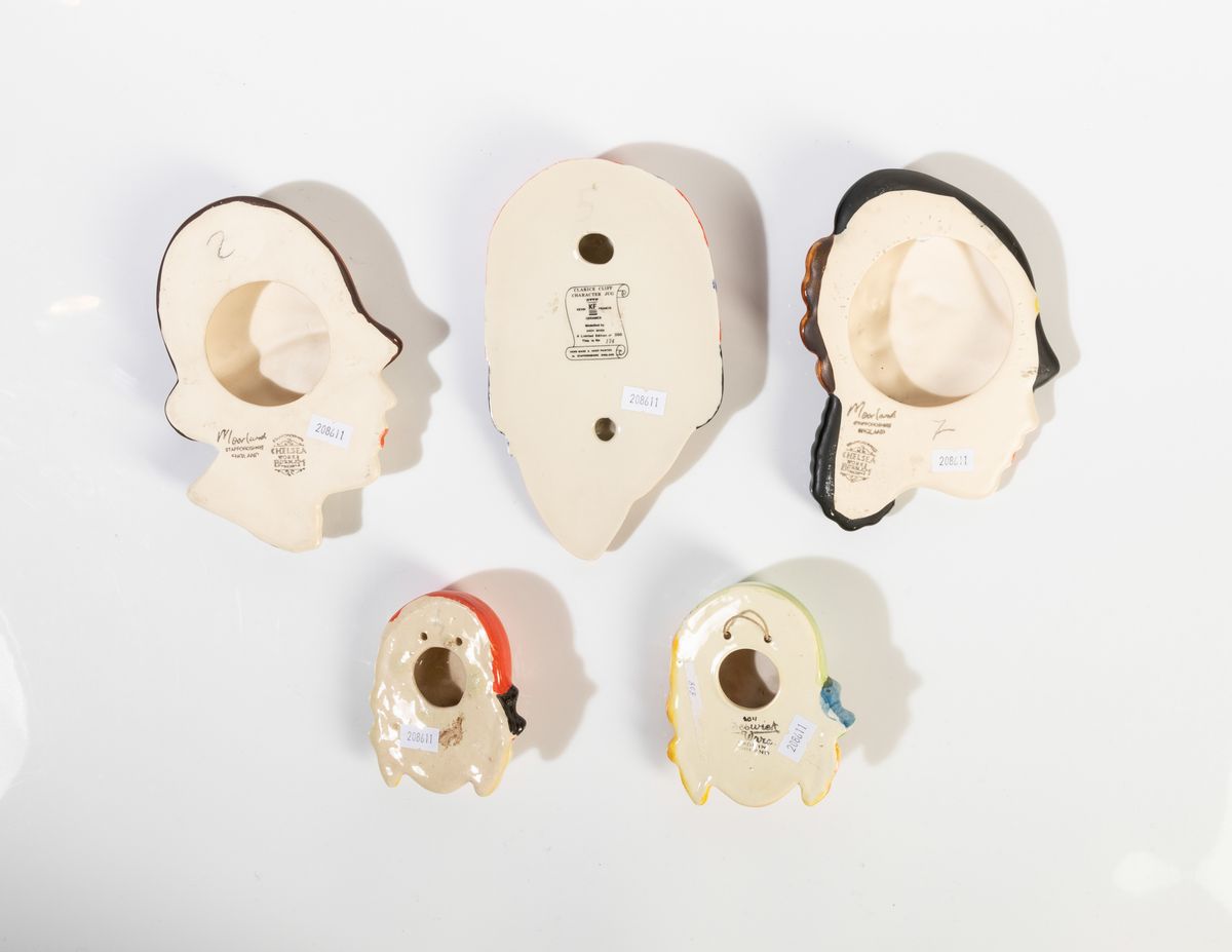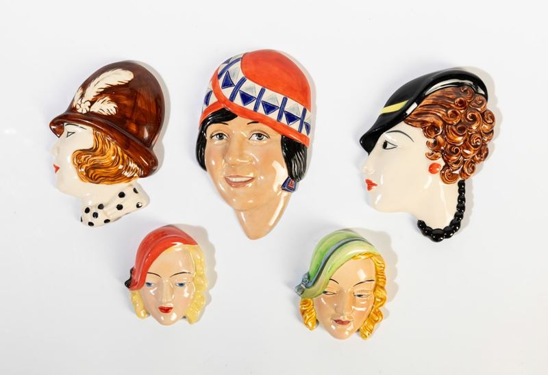 Cinque profili di donna in terraglia a colaggio con decoro di smalti policromi.