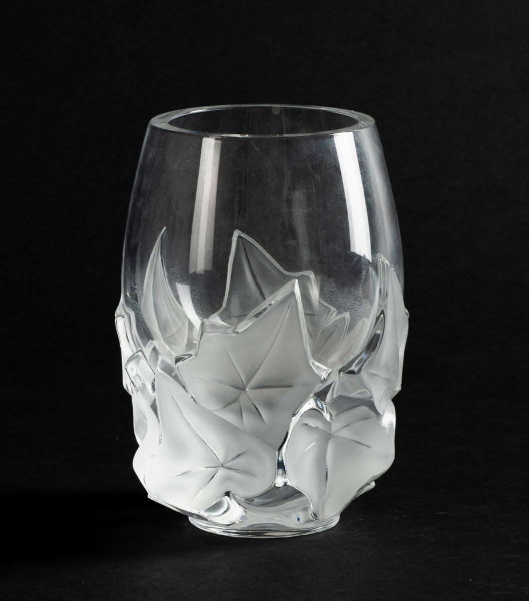 Vaso in cristallo soffiato con decoro di foglie di edera sabbiate.