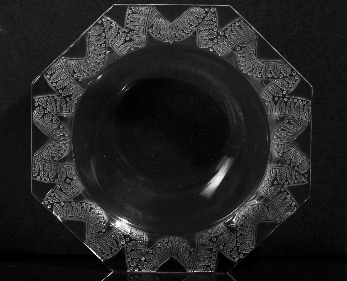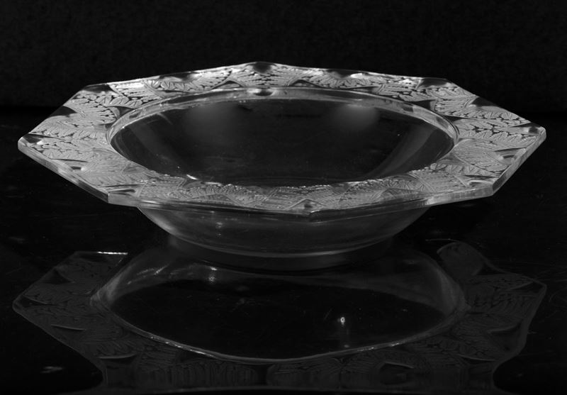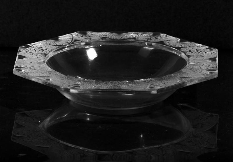 Ciotola semisferica in cristallo molato con bordo ottagonale decorato a ghirlande.